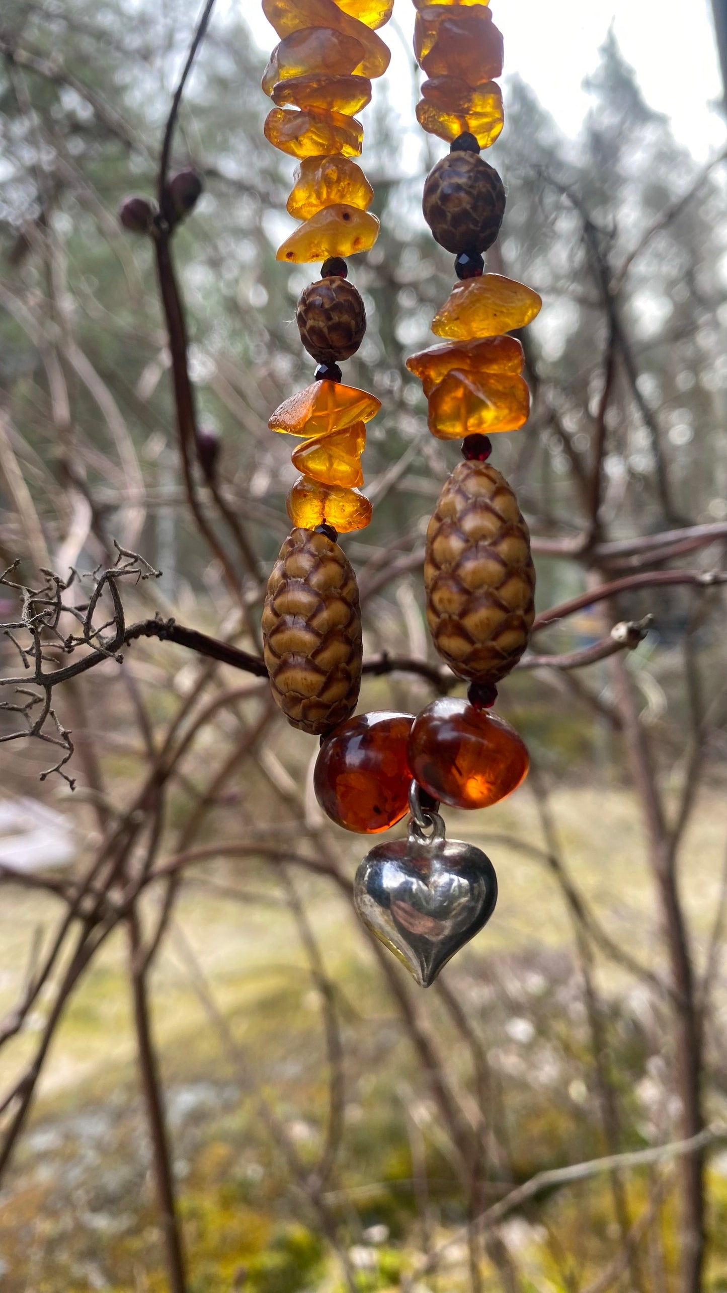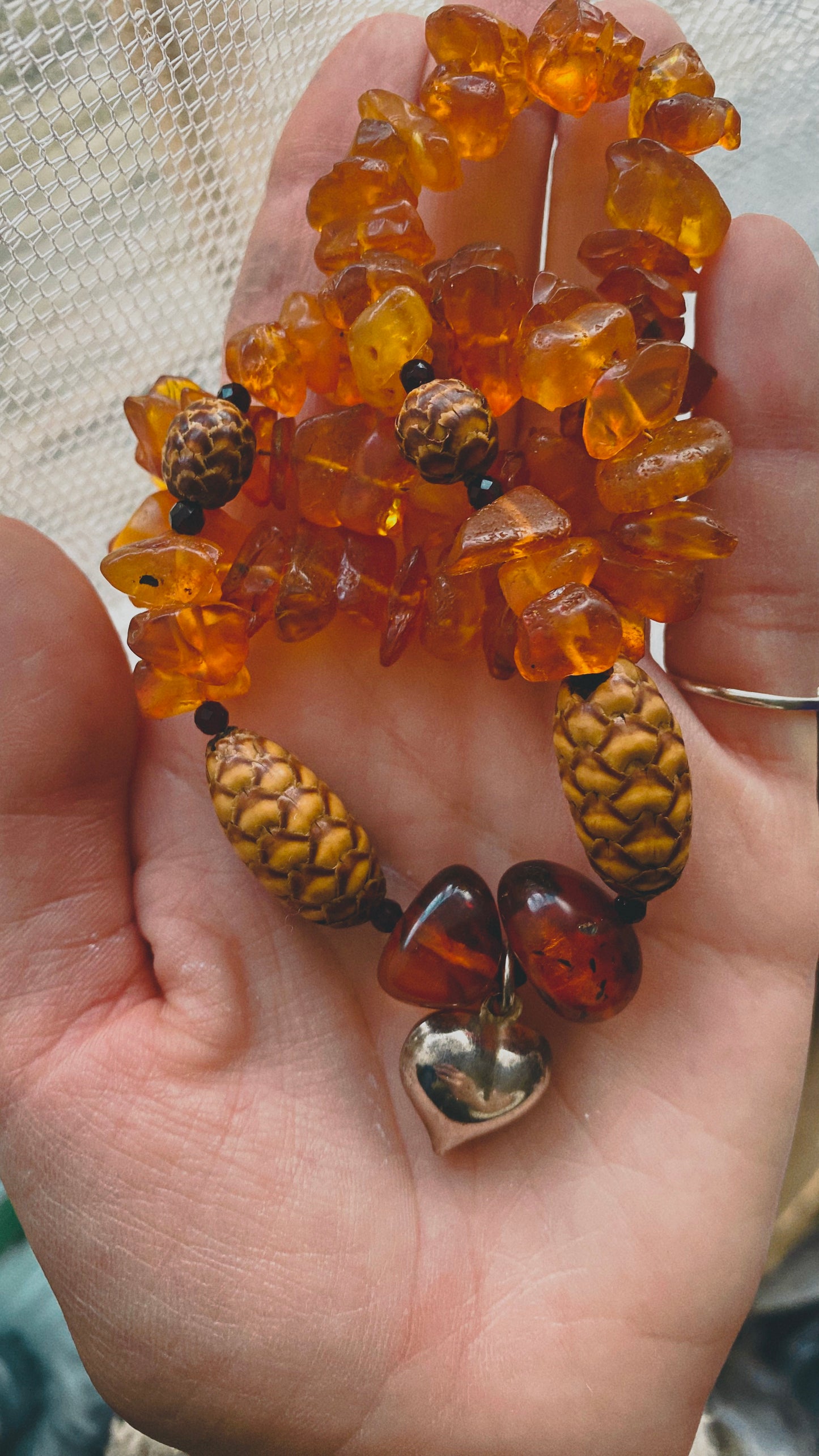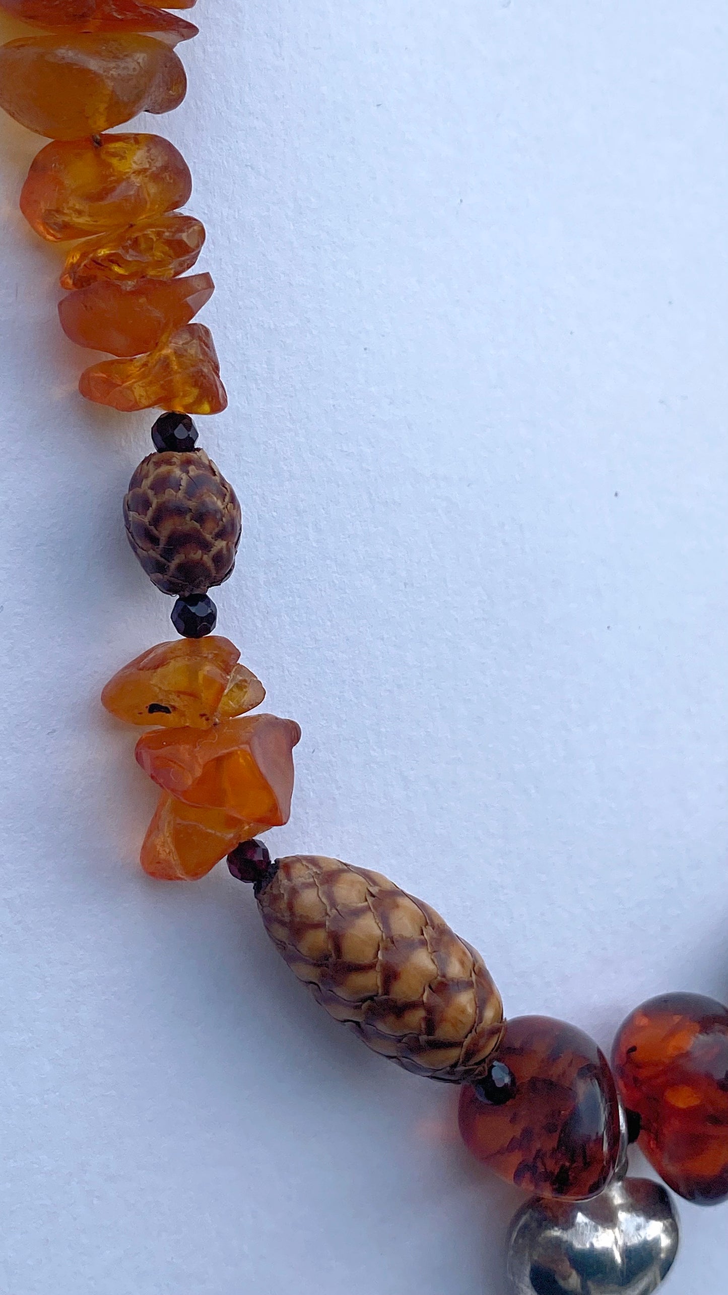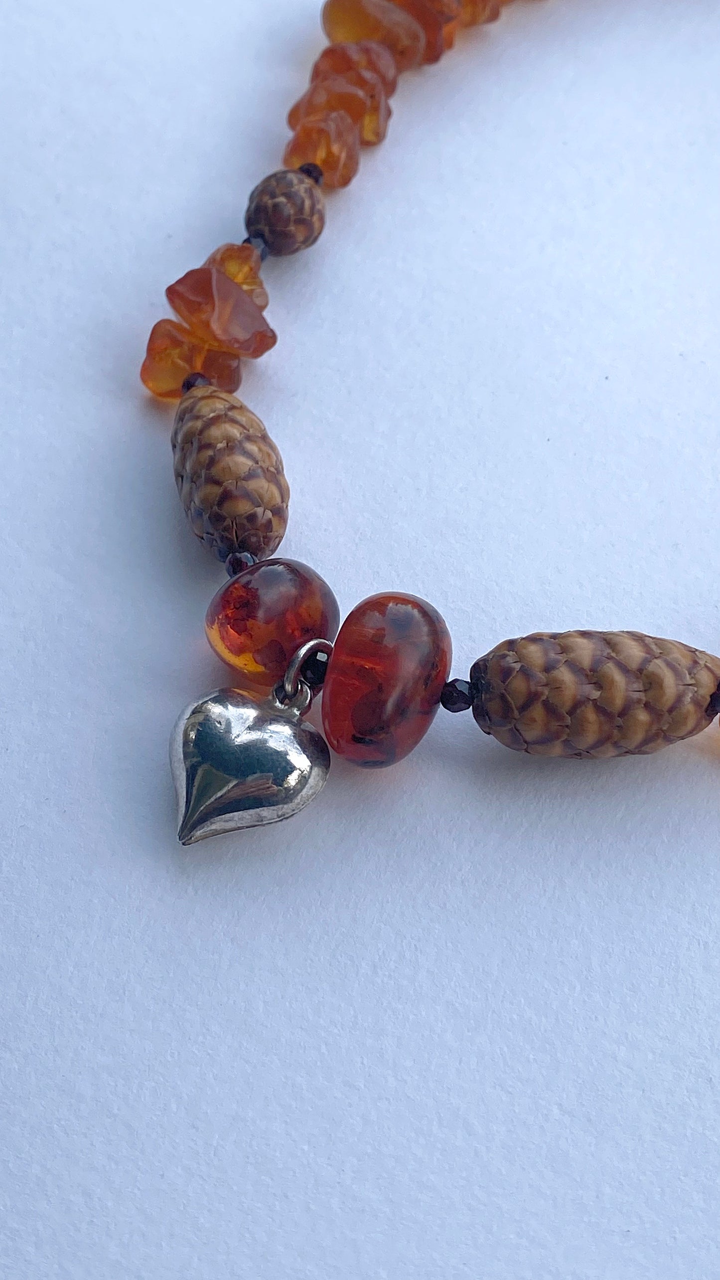 gorgeous baltic amber interspersed with faceted garnet gemstone and natural pinecone beads. vintage silver (925) rounded silver heart.