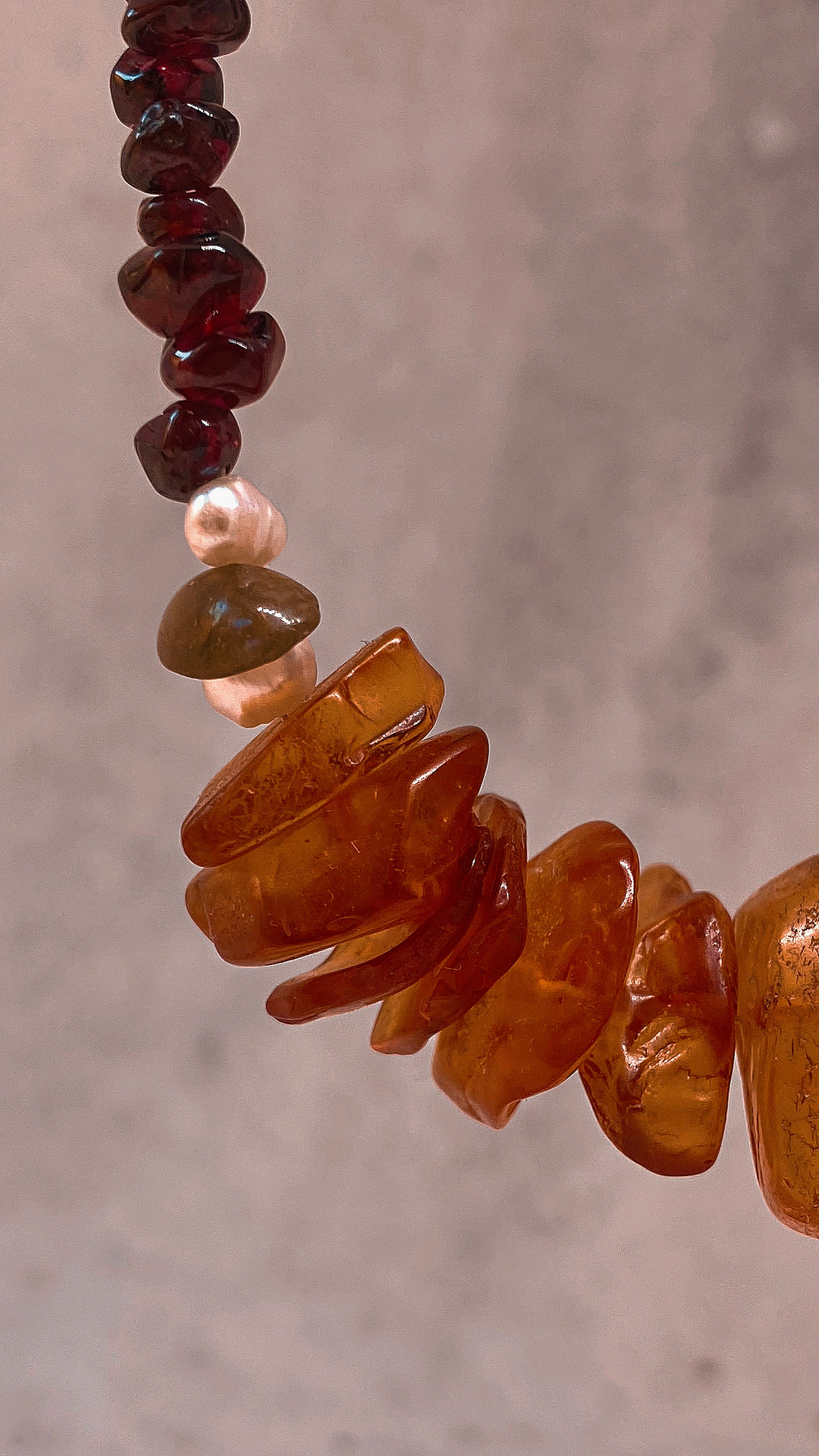 mini garnets that truly look like pomegranate seeds and massive, textured baltic amber. catches light in incredible ways. (spaced with fresh water pearl & labradorite)