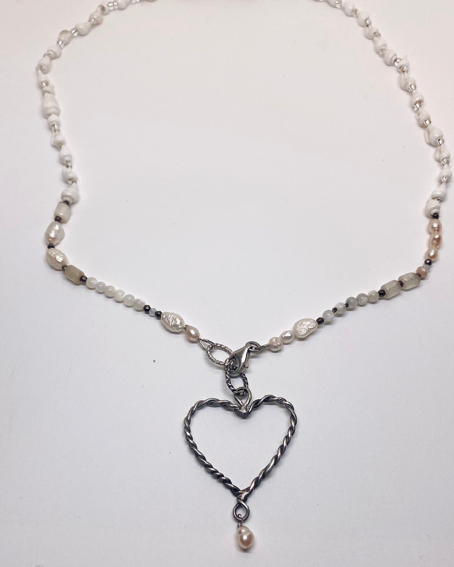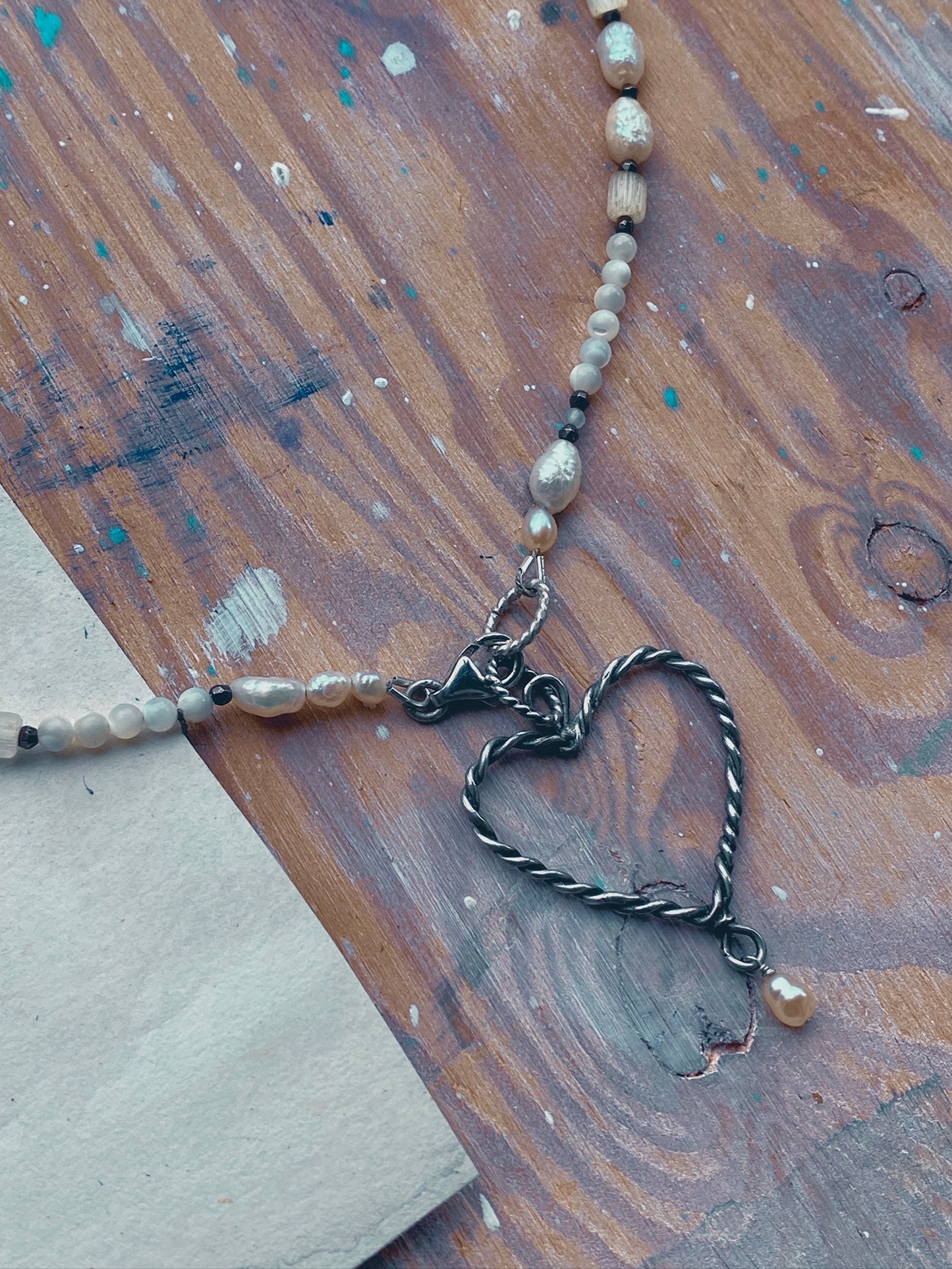 twisted heart with moving fresh water pearl teardrop. hand carved, one of a kind, will never be cast again. the pendant is detachable and can be worn on a chain, or other strand. the strand can be worn sans pendant as well.