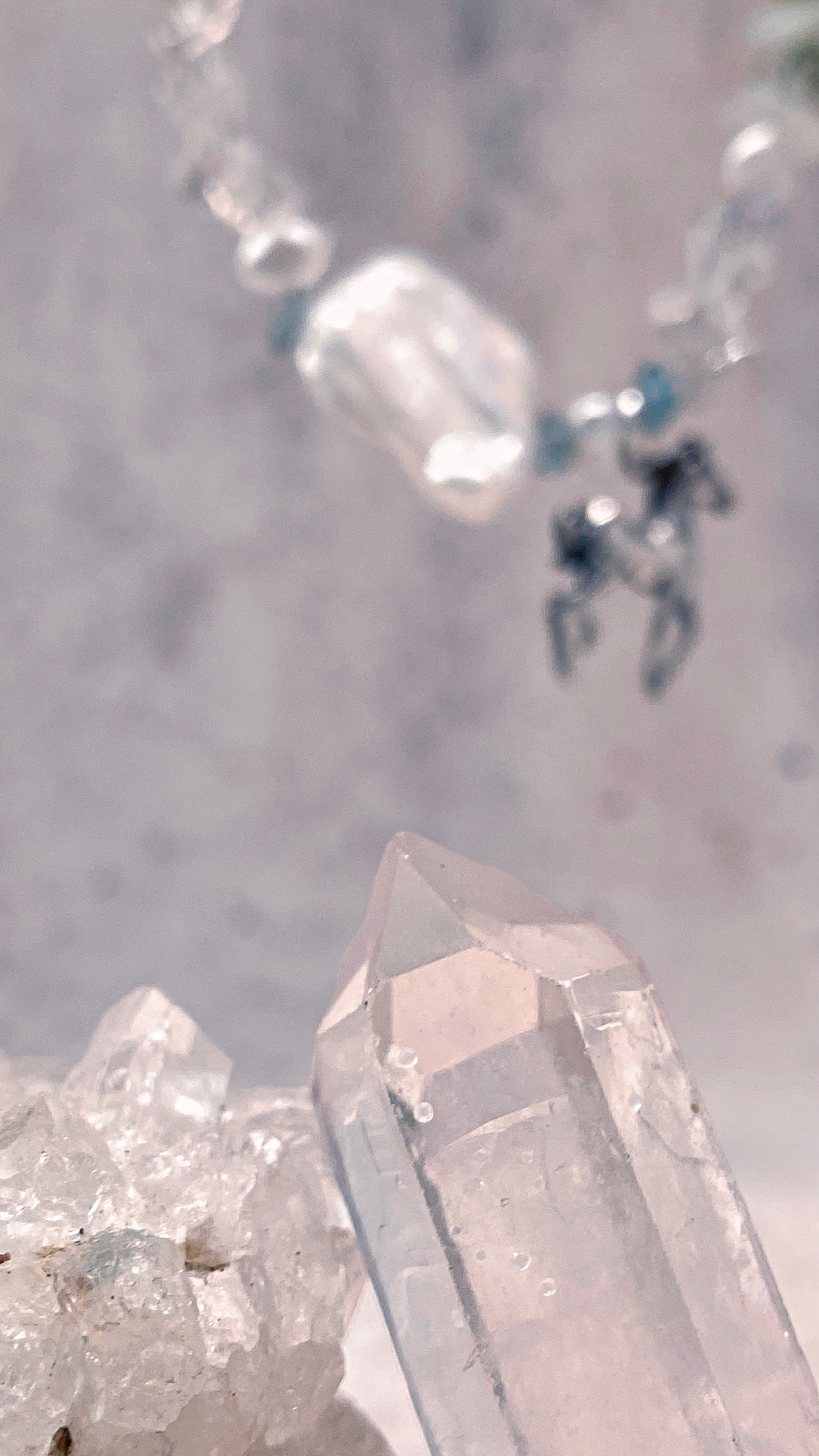 fresh water biwa pearl, apatite, clear quartz. vintage silver (925) foal pendant.