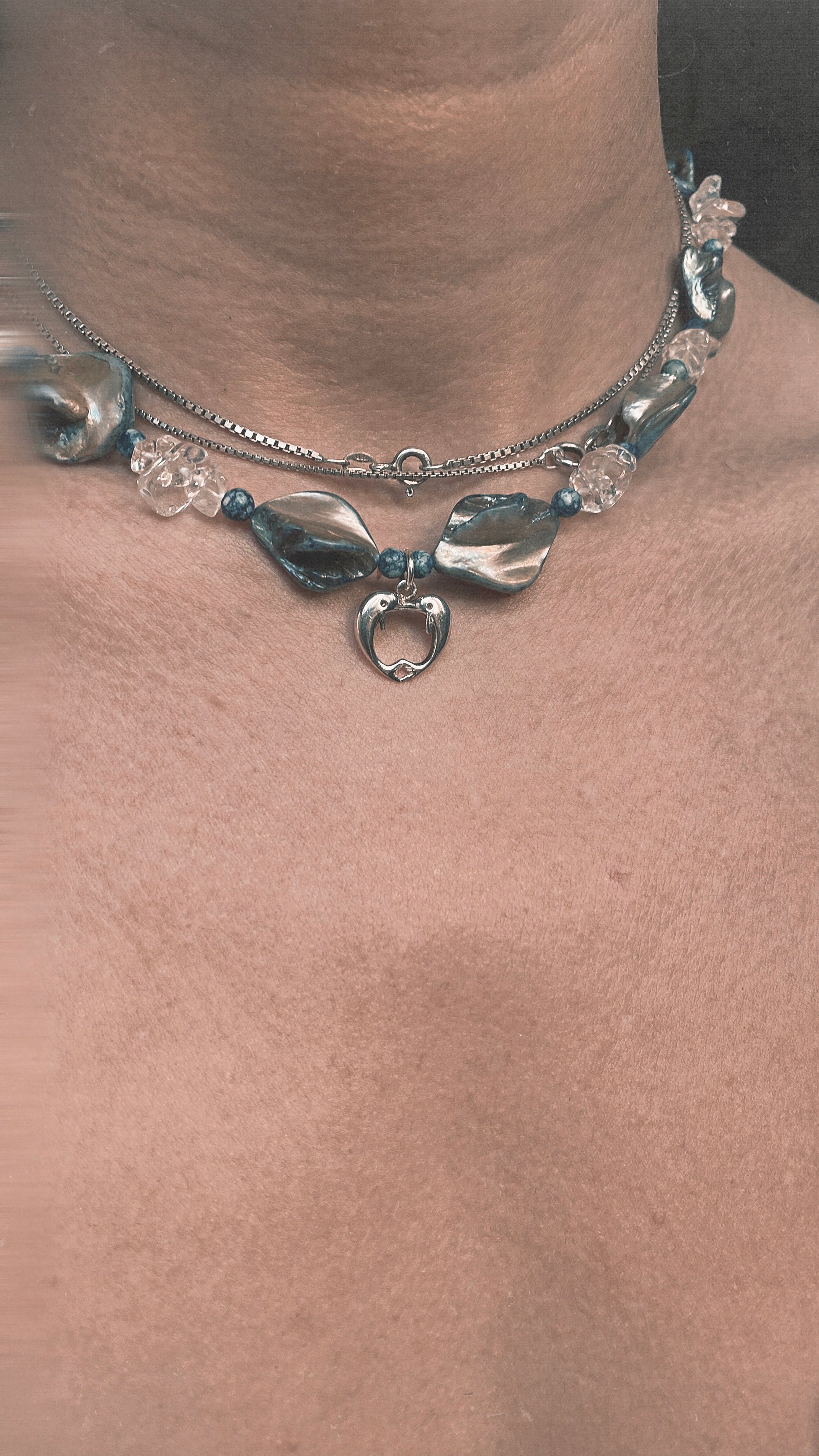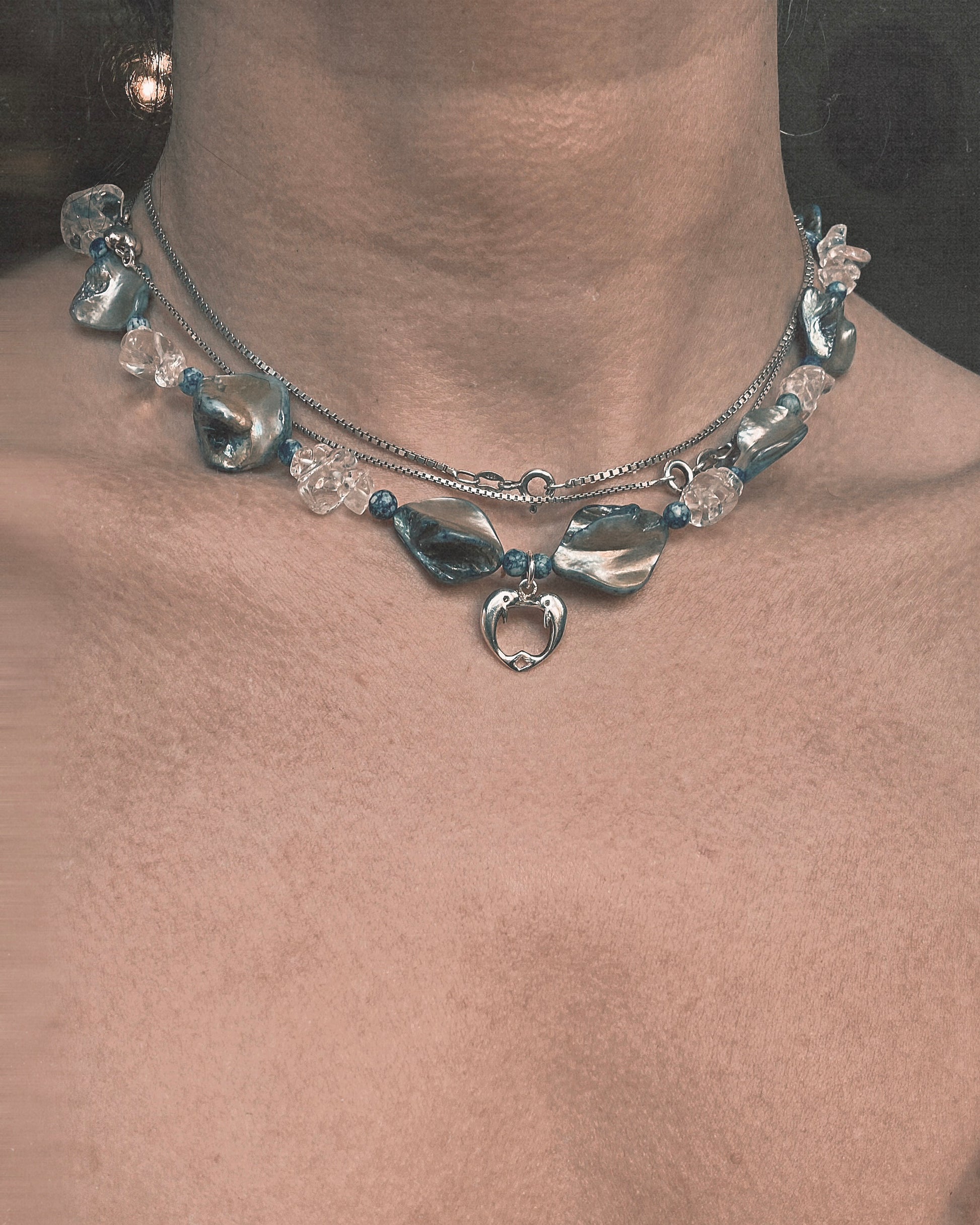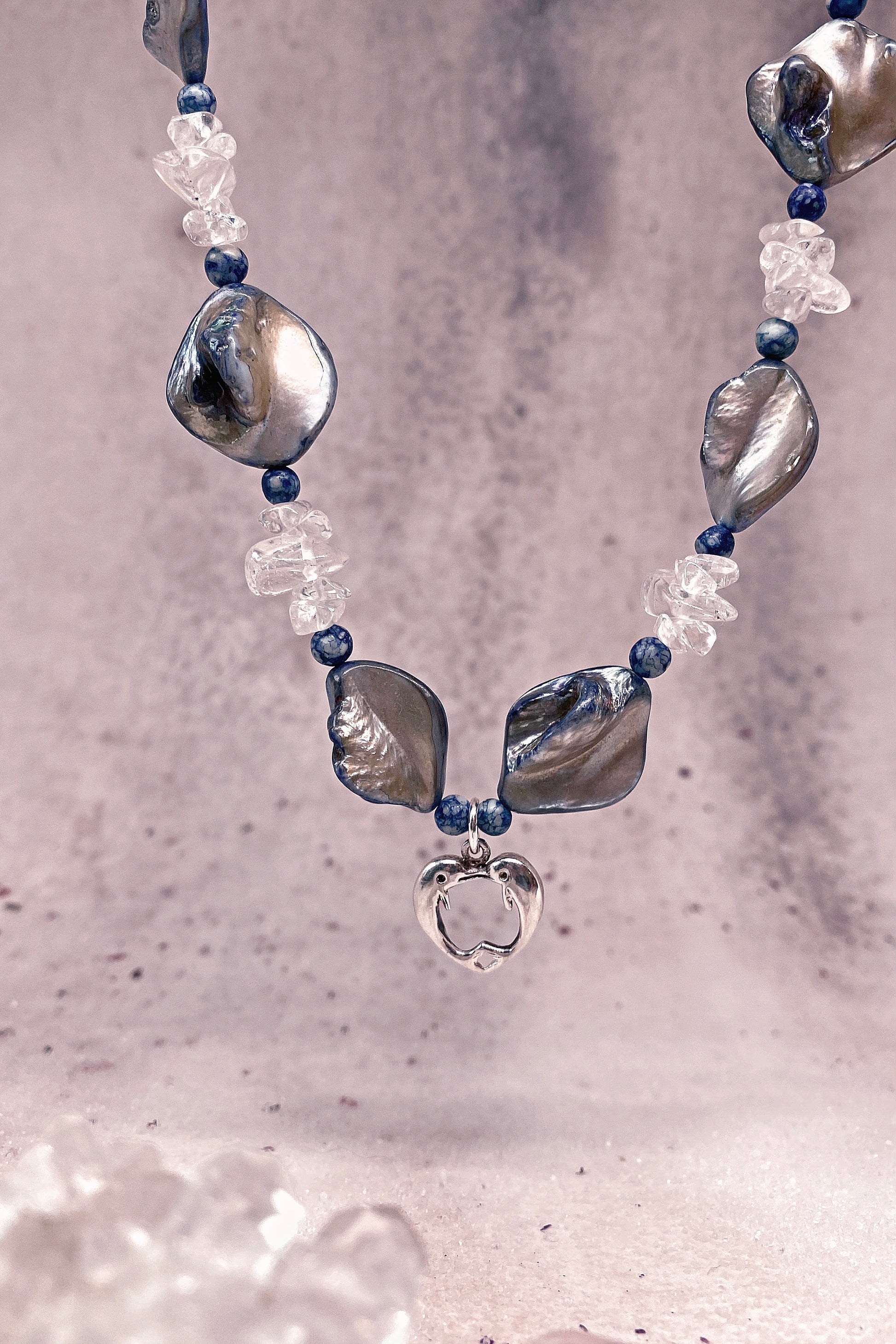polished vintage seashell beads with evocative texture and shape, offset with light crystal quartz chips and blue sodalite. vintage silver (925) dolphin love heart pendant.