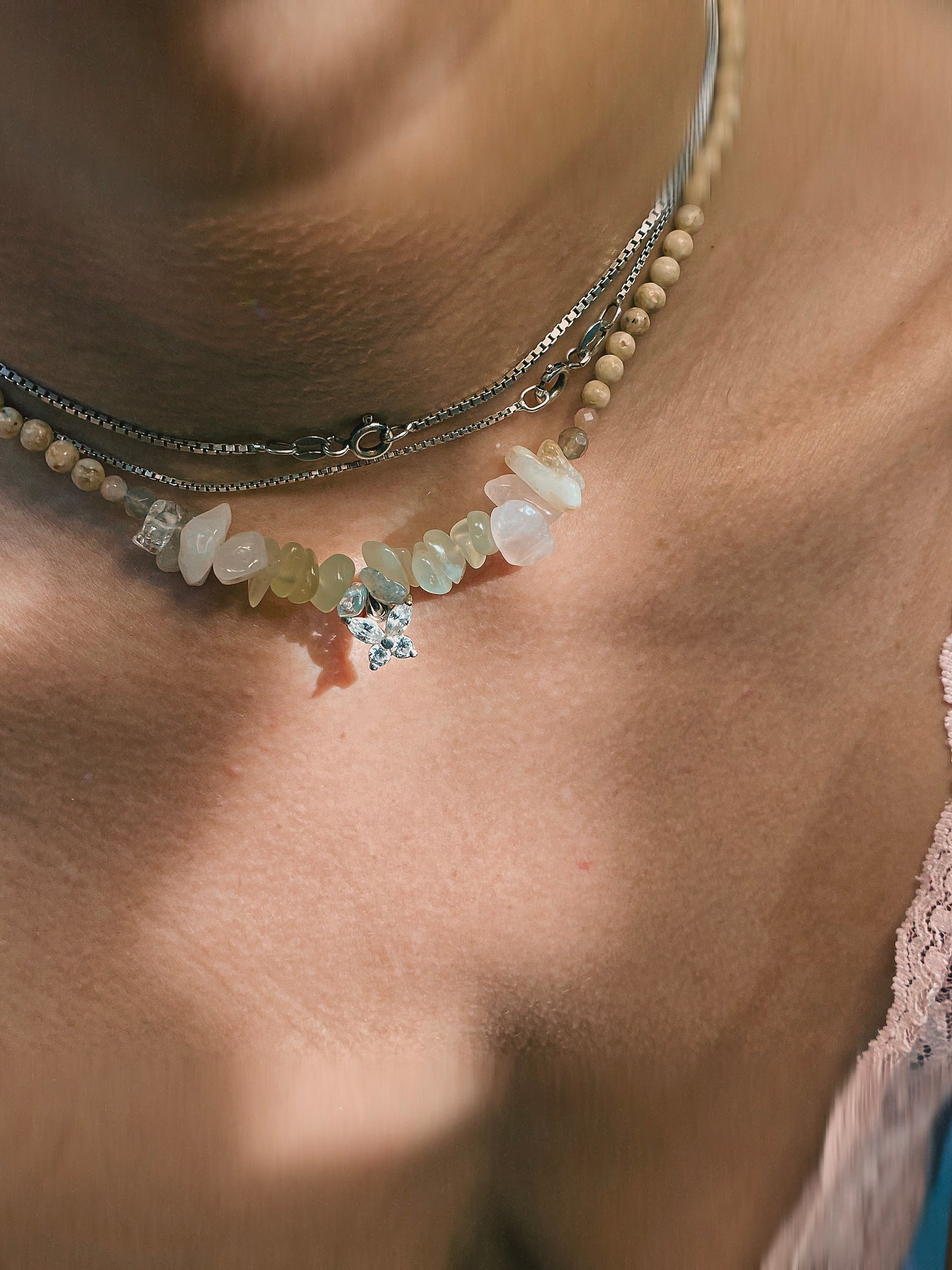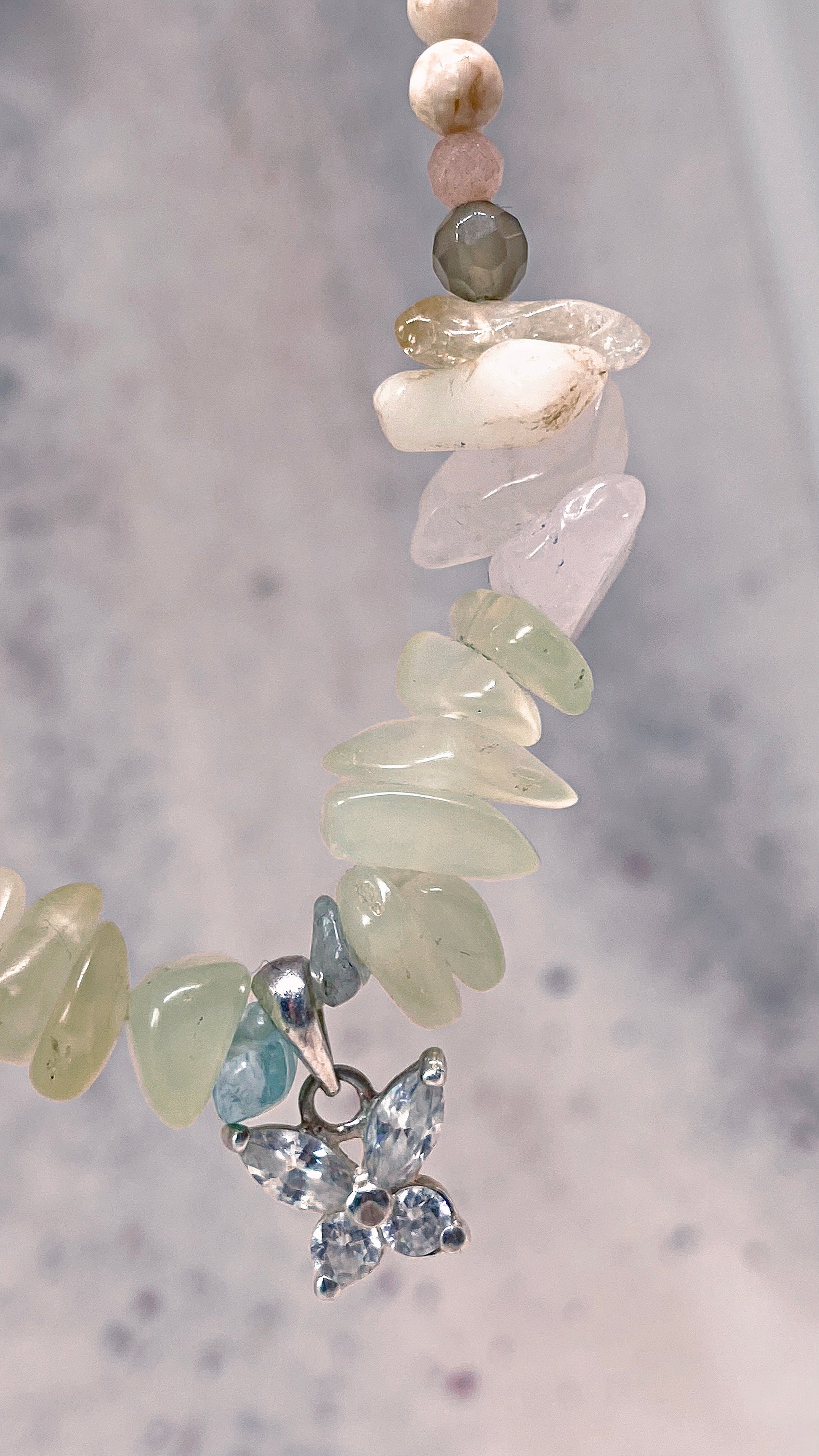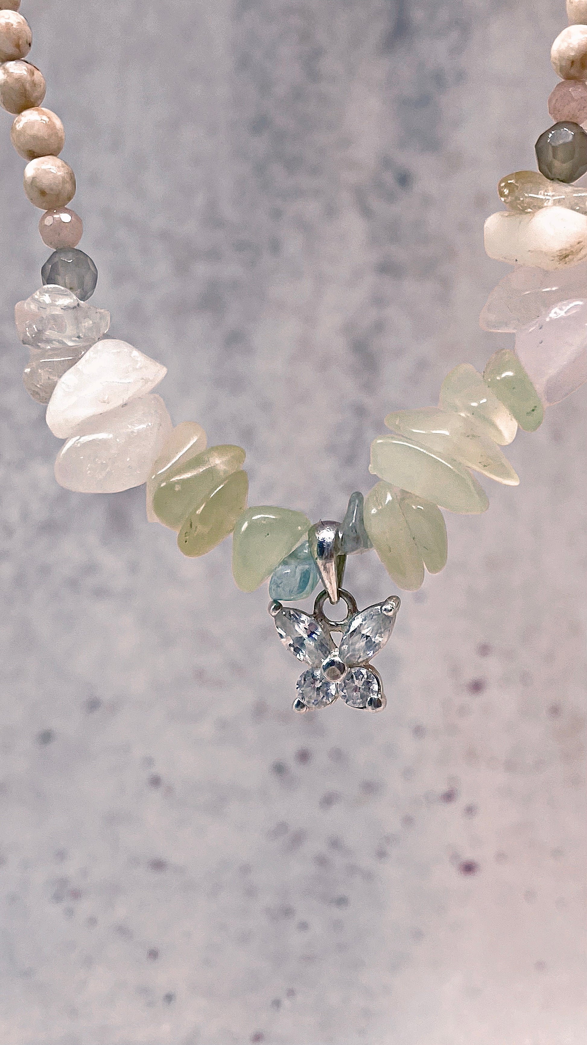 howlite with gemstone gradient; jade, apatite, rose quartz. vintage silver (925) butterfly pendant with crystalline wings.