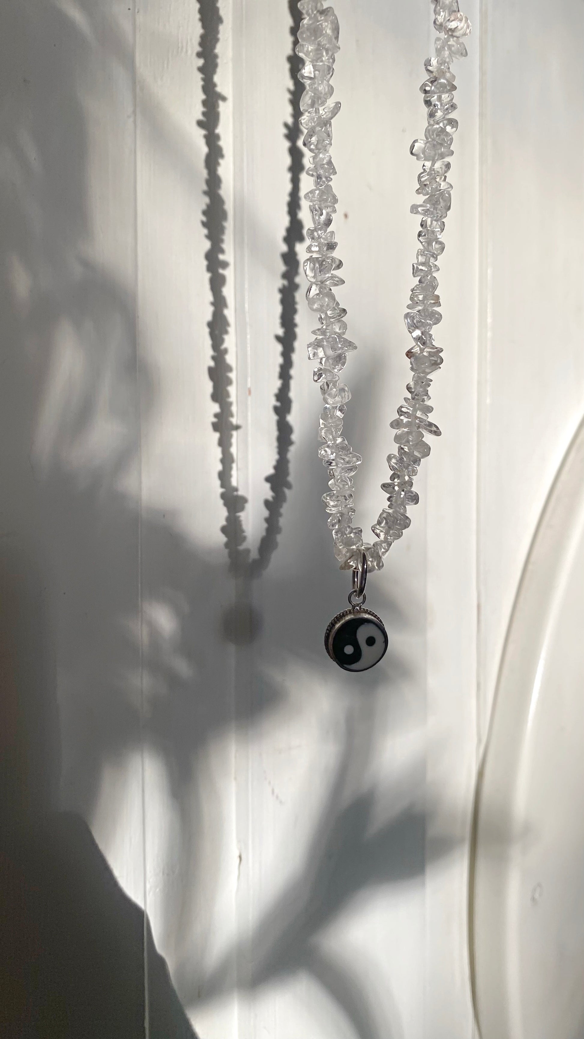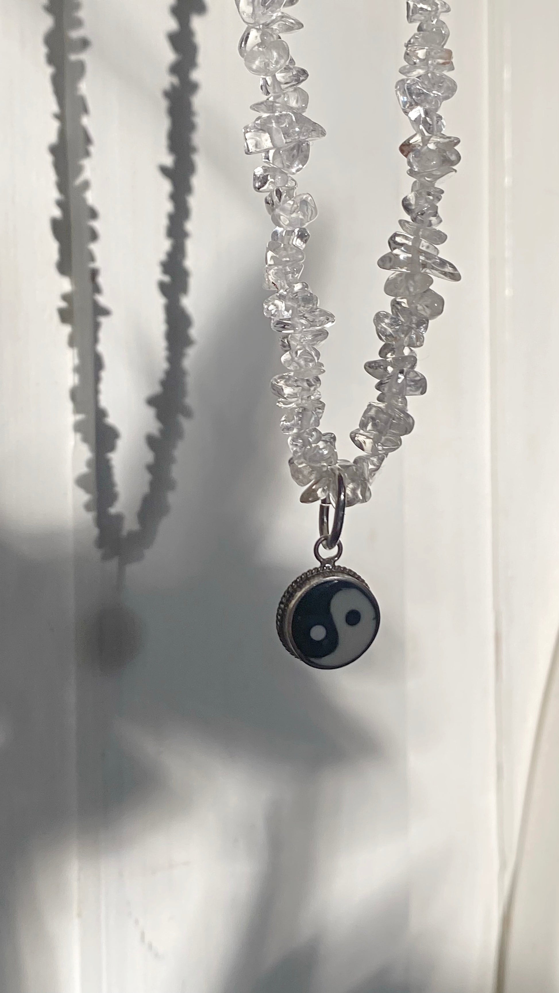 clear mini quartz chip strand. vintage silver (925) 1990s yin yang enamel pendant.