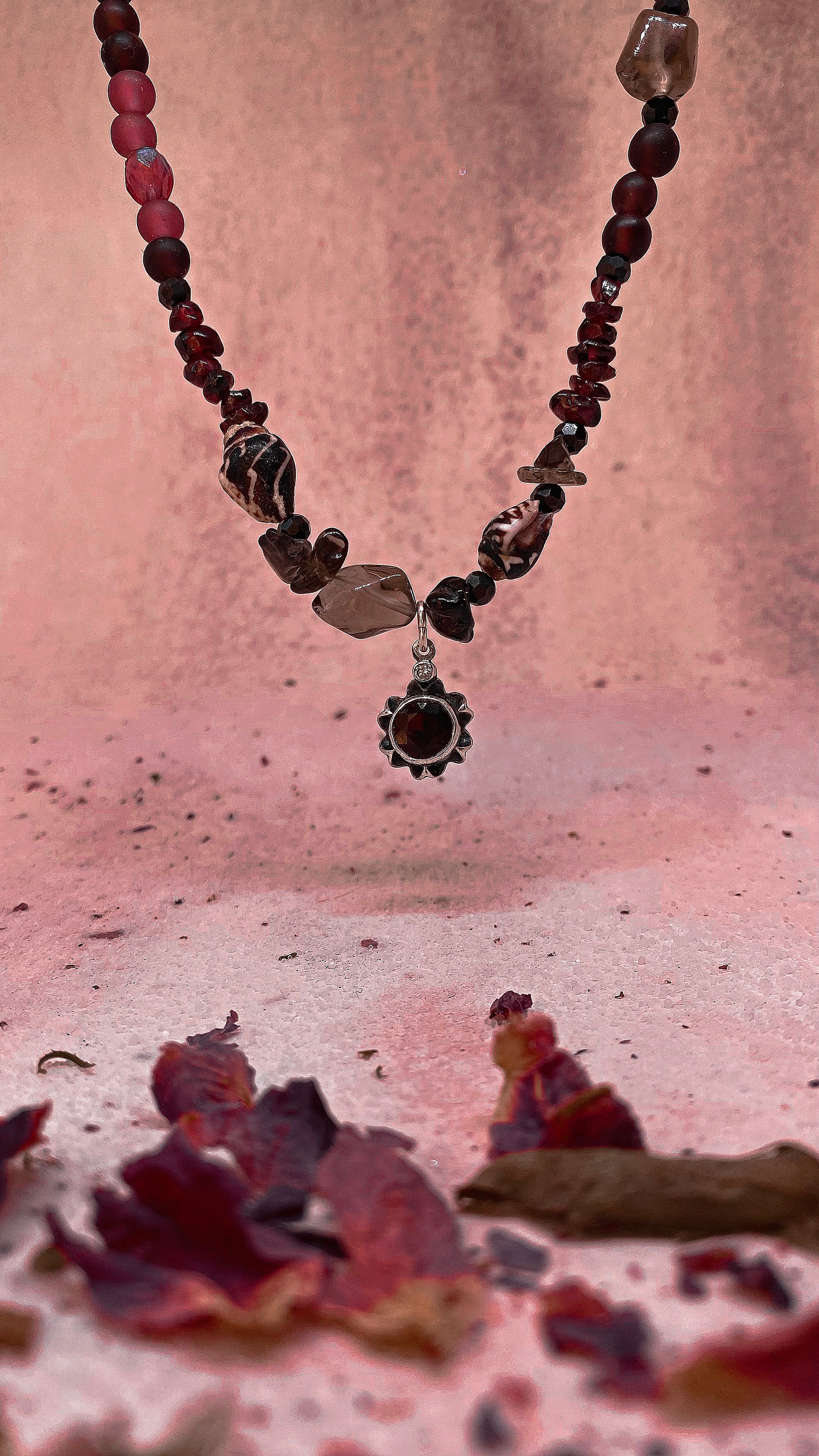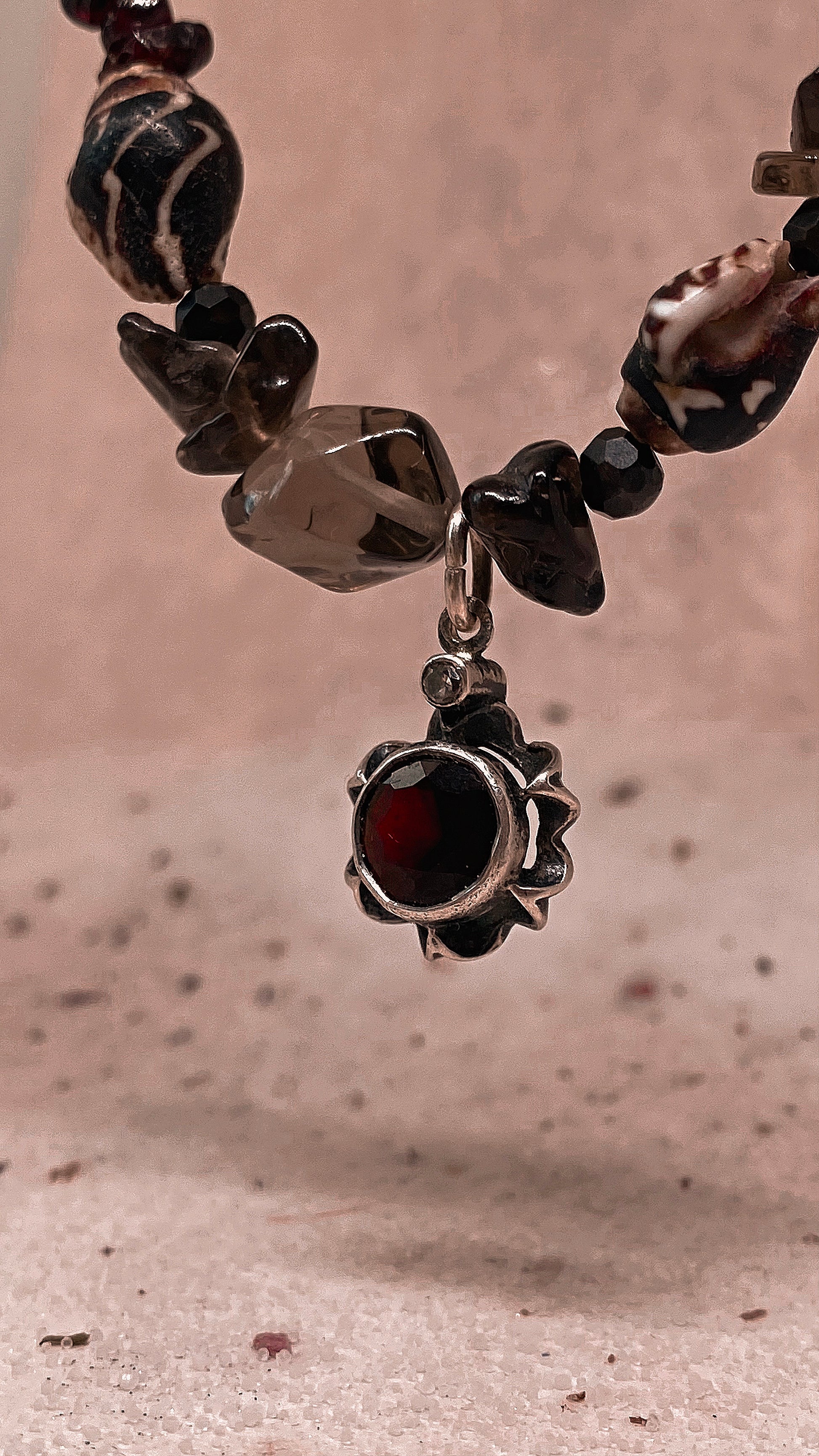 garnet, mini seashells, smoky quartz chunks and glass. vintage silver (925) flower pendant with large, faceted garnet & mini zirconia (or spinel).