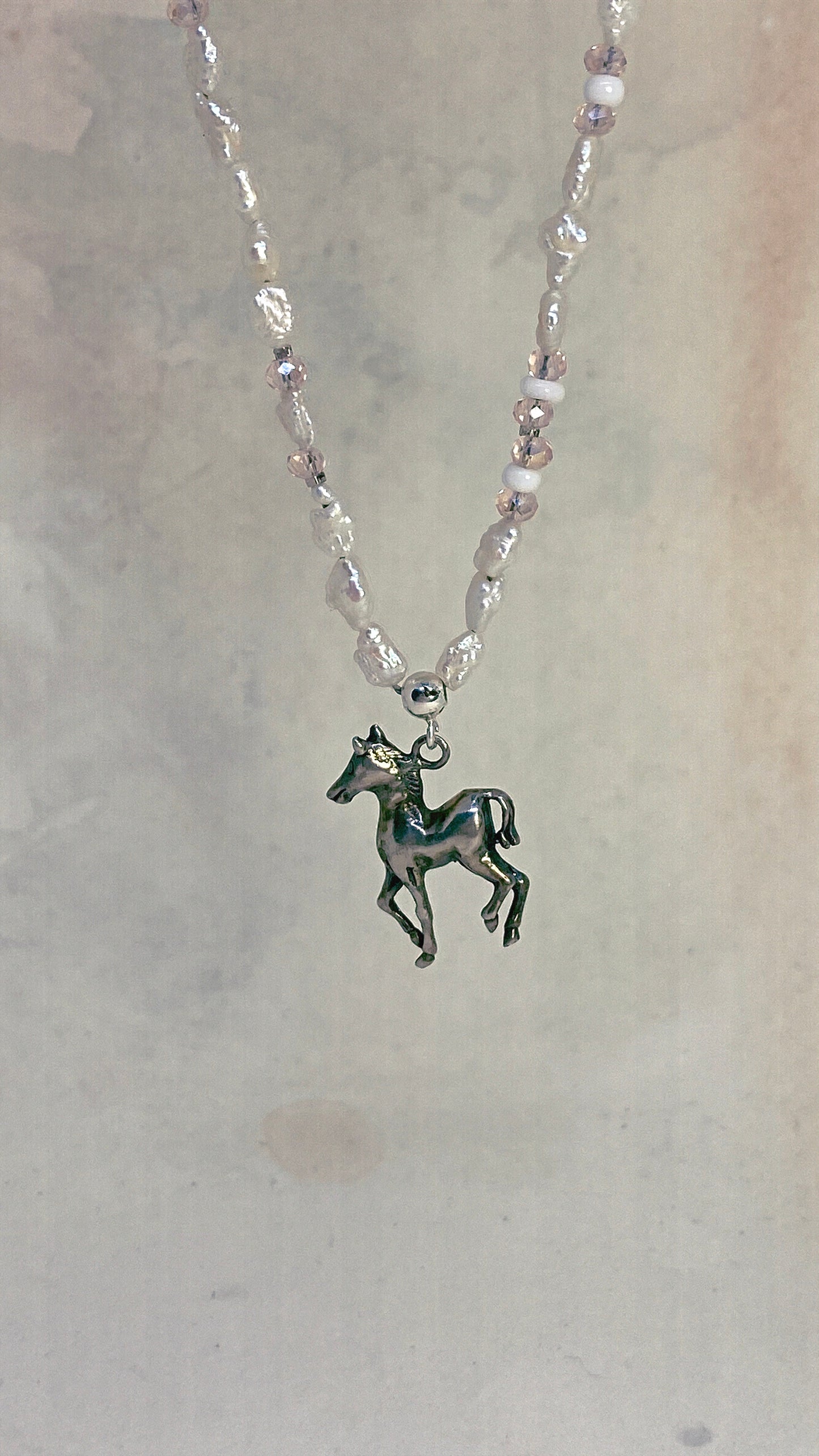 vintage silver (925) pony foal charm on baroque fresh water pearl & glass strand.