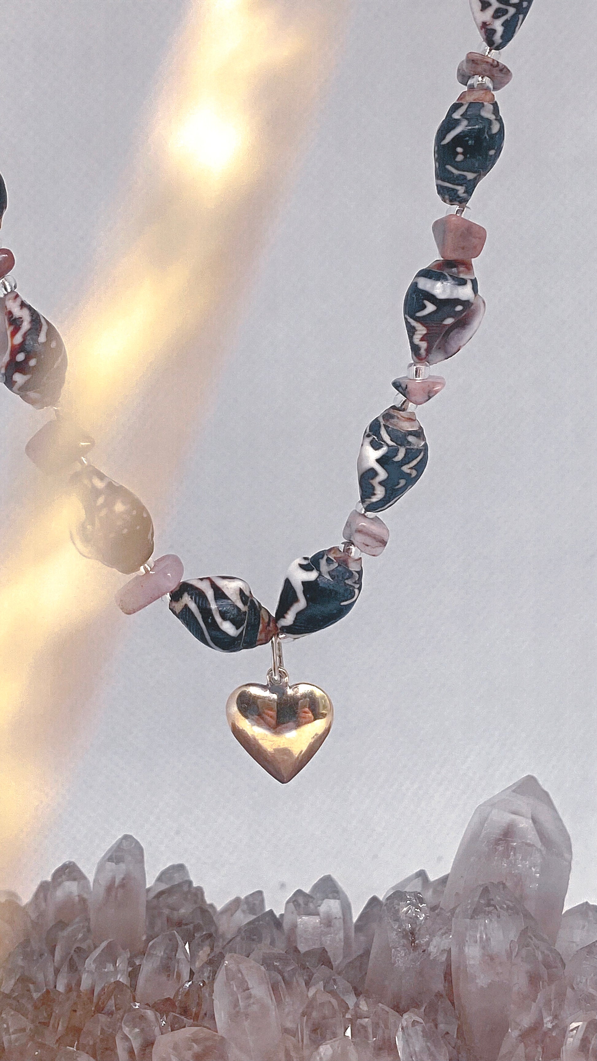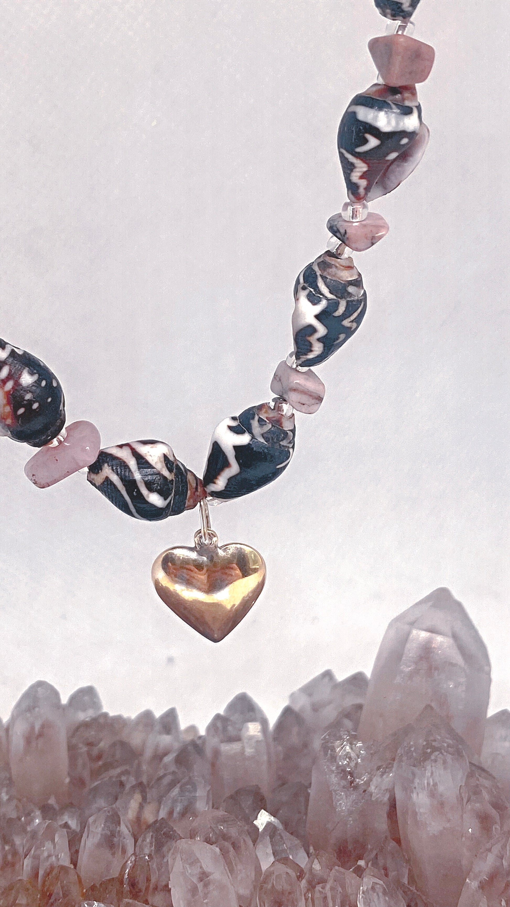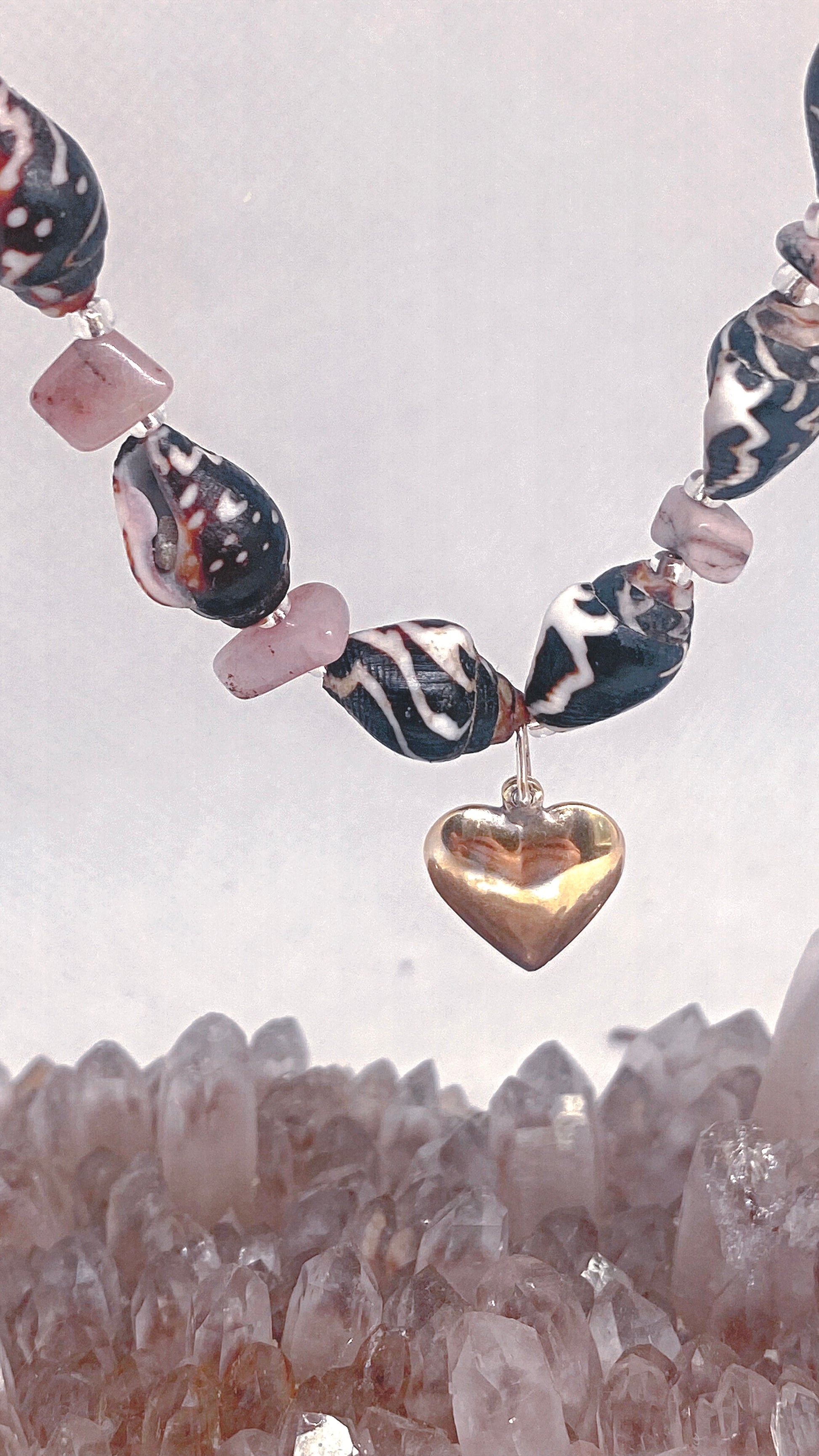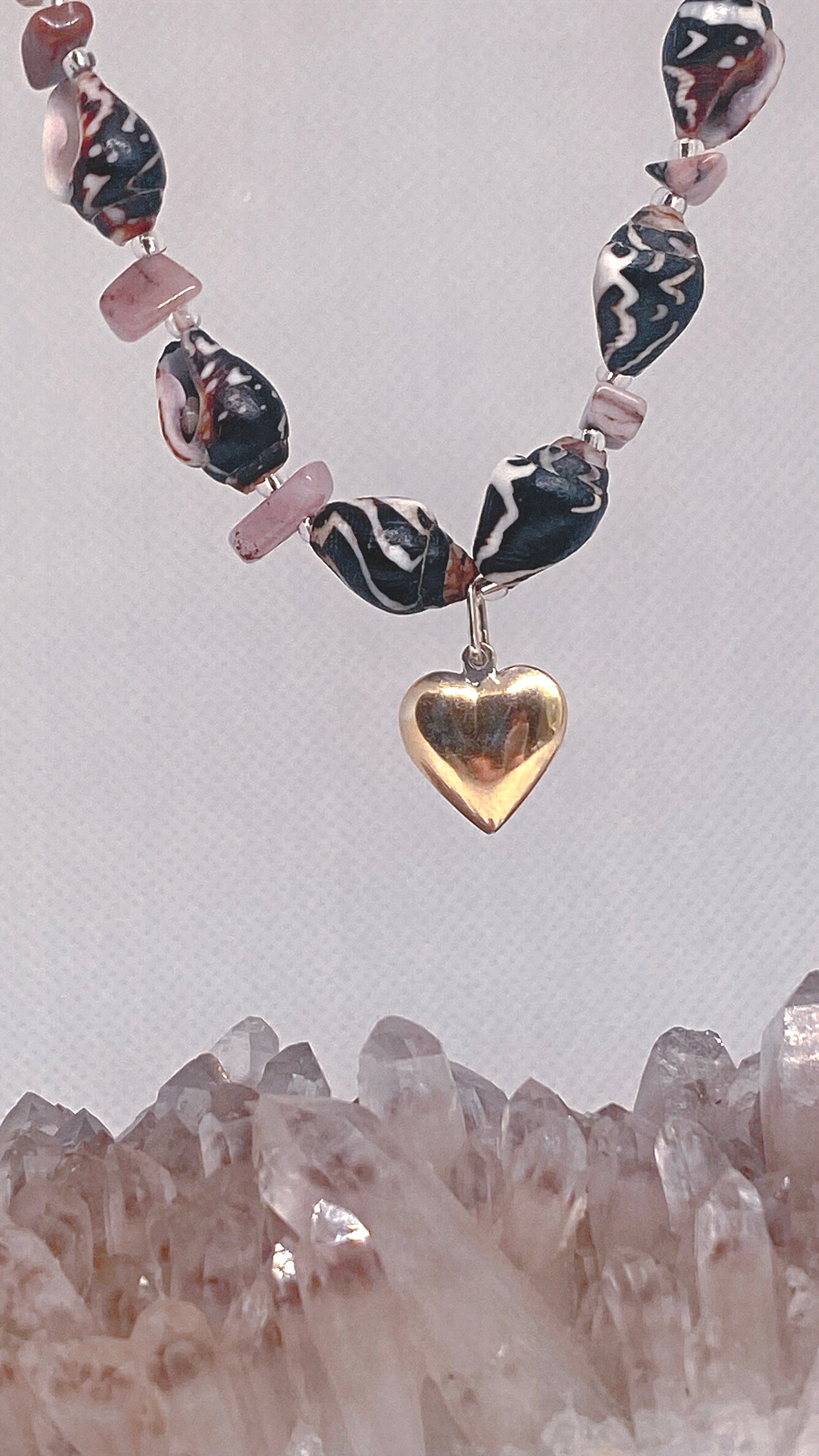 mottled mini shells and jasper with vintage gold plated silver heart