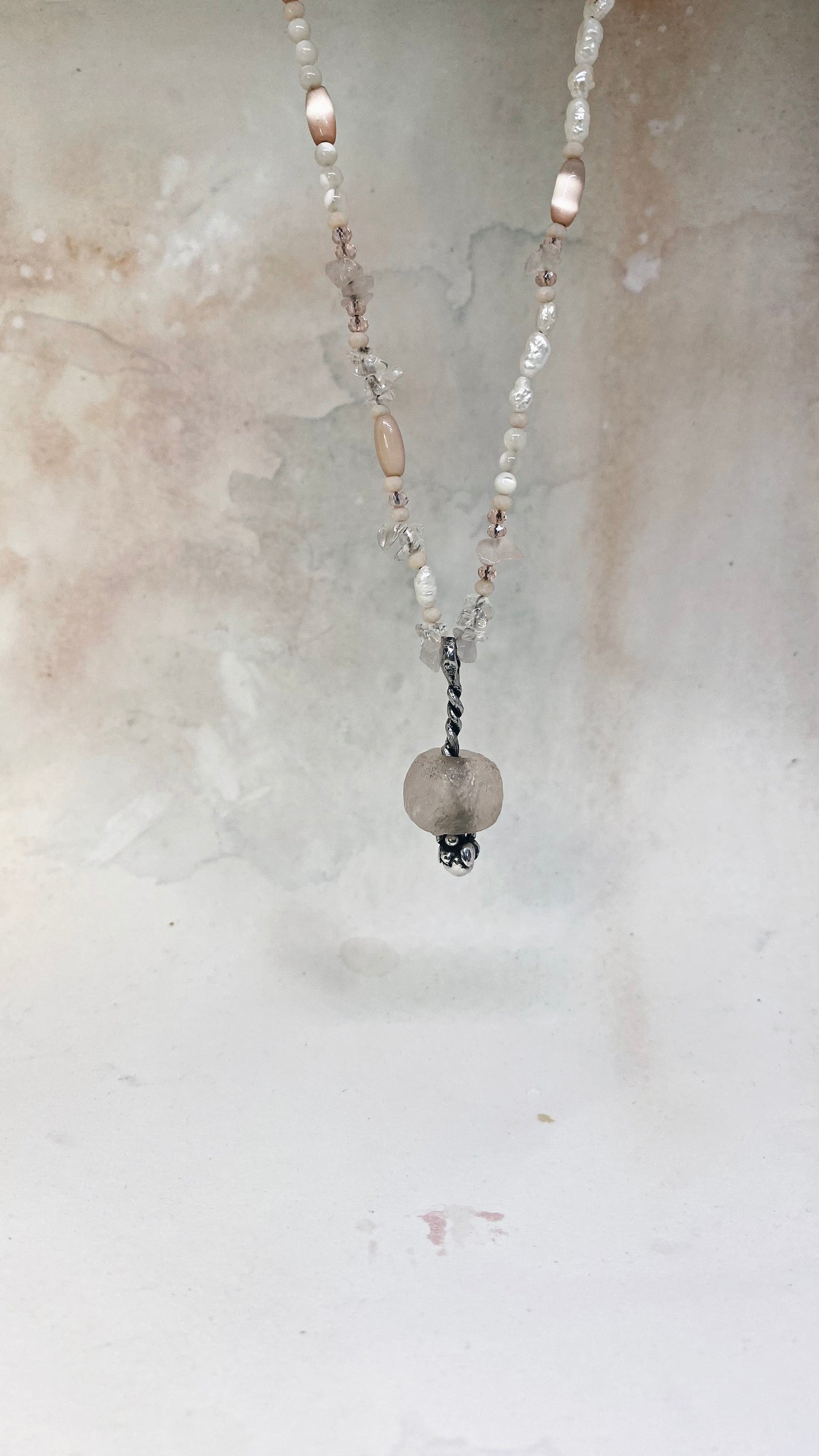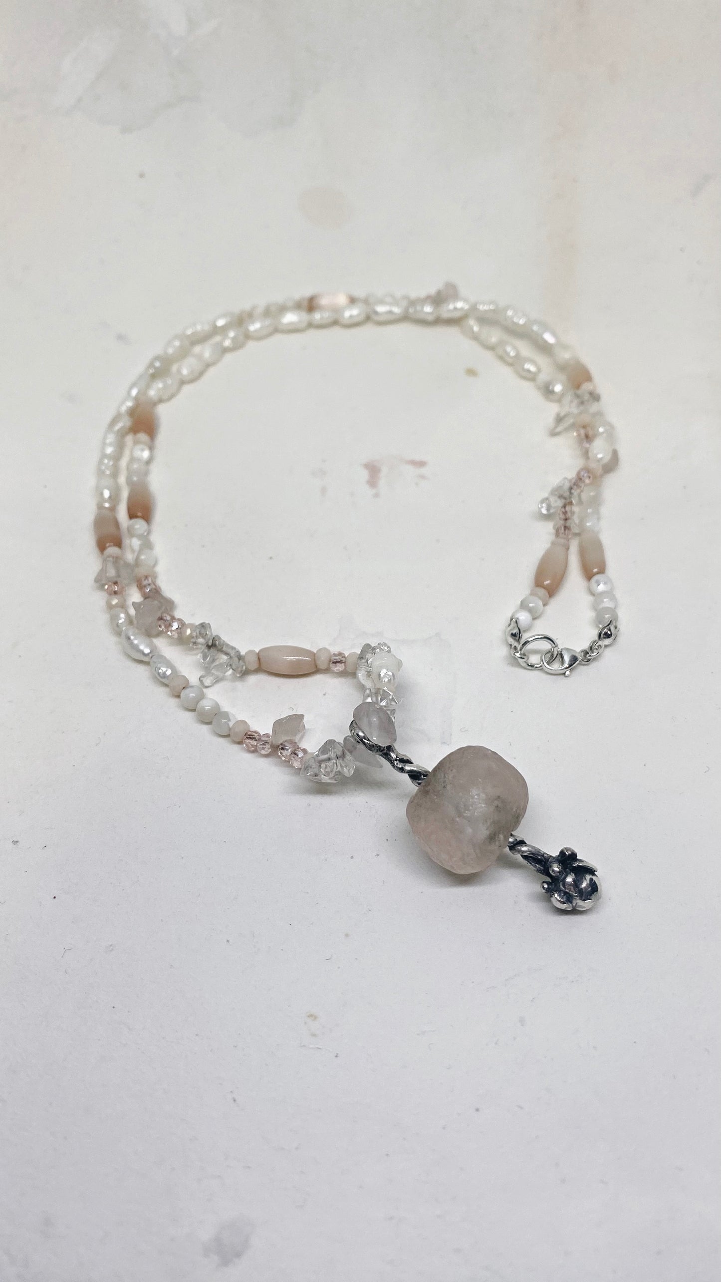 bead strand: freshwater pearl, rose quartz, seashell, glass, moonglow vintage lucite, sunstone.