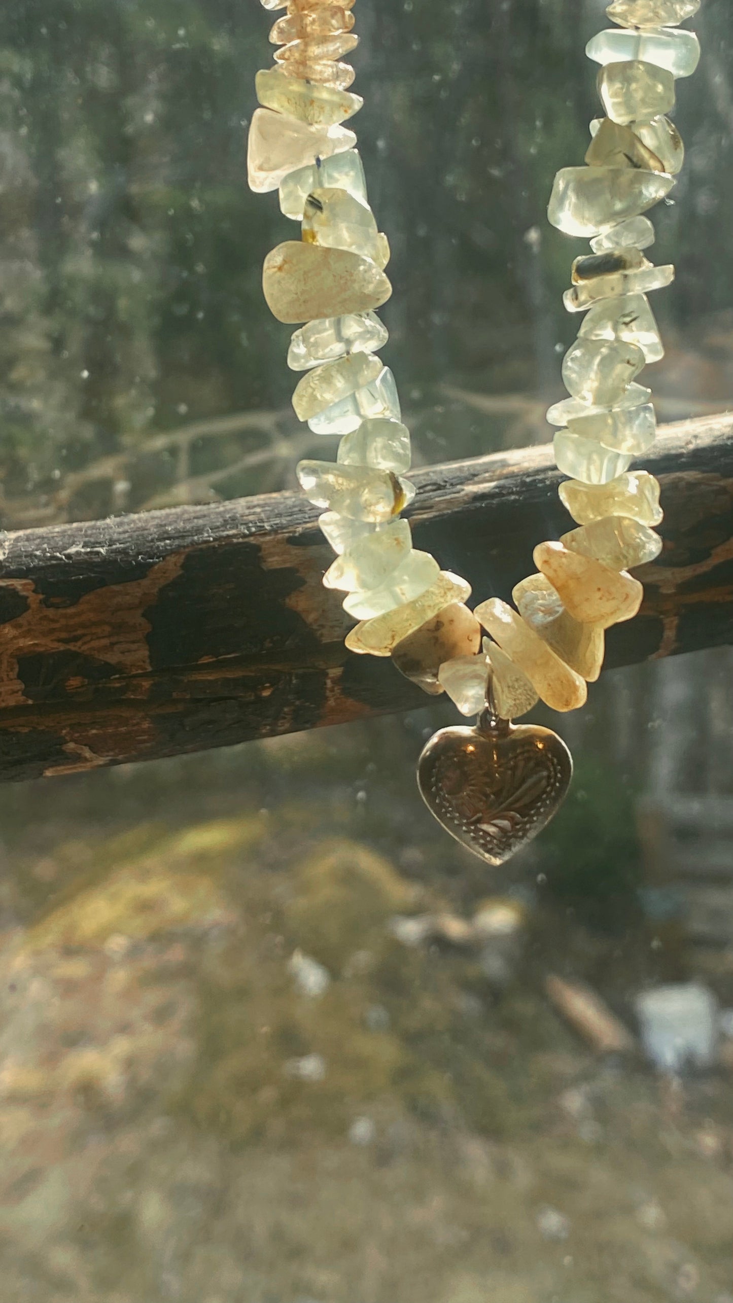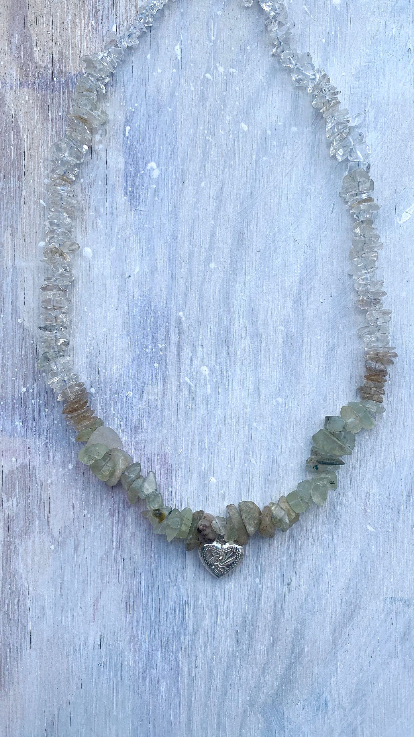 textured gradient of clear quartz, smoky quartz, jade, peridot, aventurine and citrine set with vintage silver (925) folk patterned heart pendant.