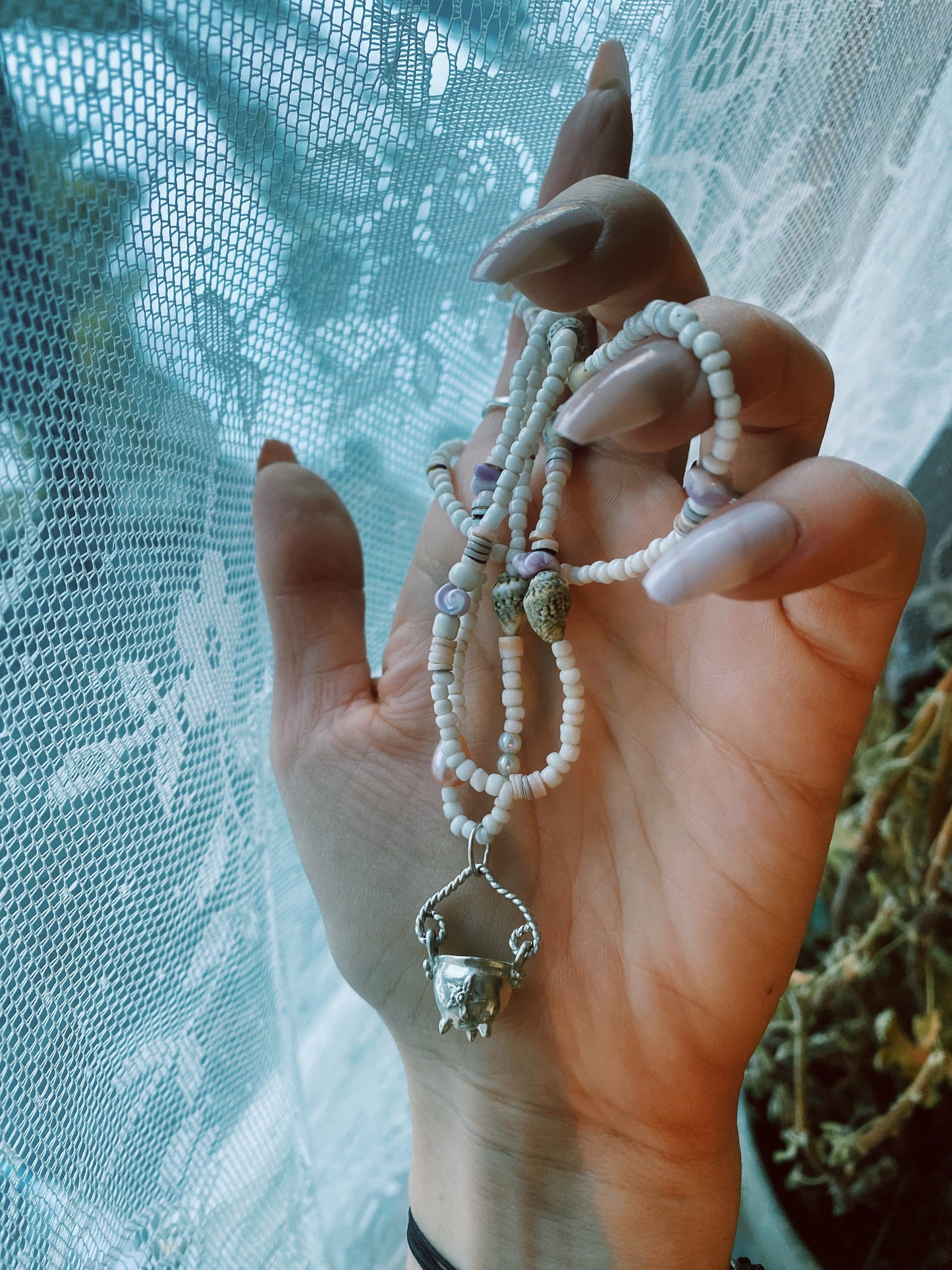 pearls for purity, nurture, longevity, seashell for ocean sound, chevron amethyst for third eye and crown.