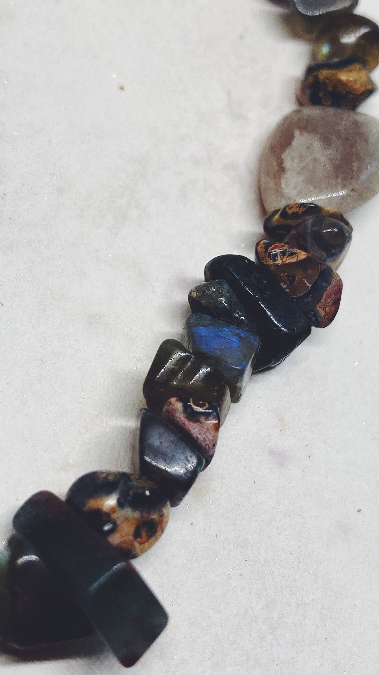 muted earth tones with stunning labradorite glints. perfect for a layered look or to uplift a casual outfit.