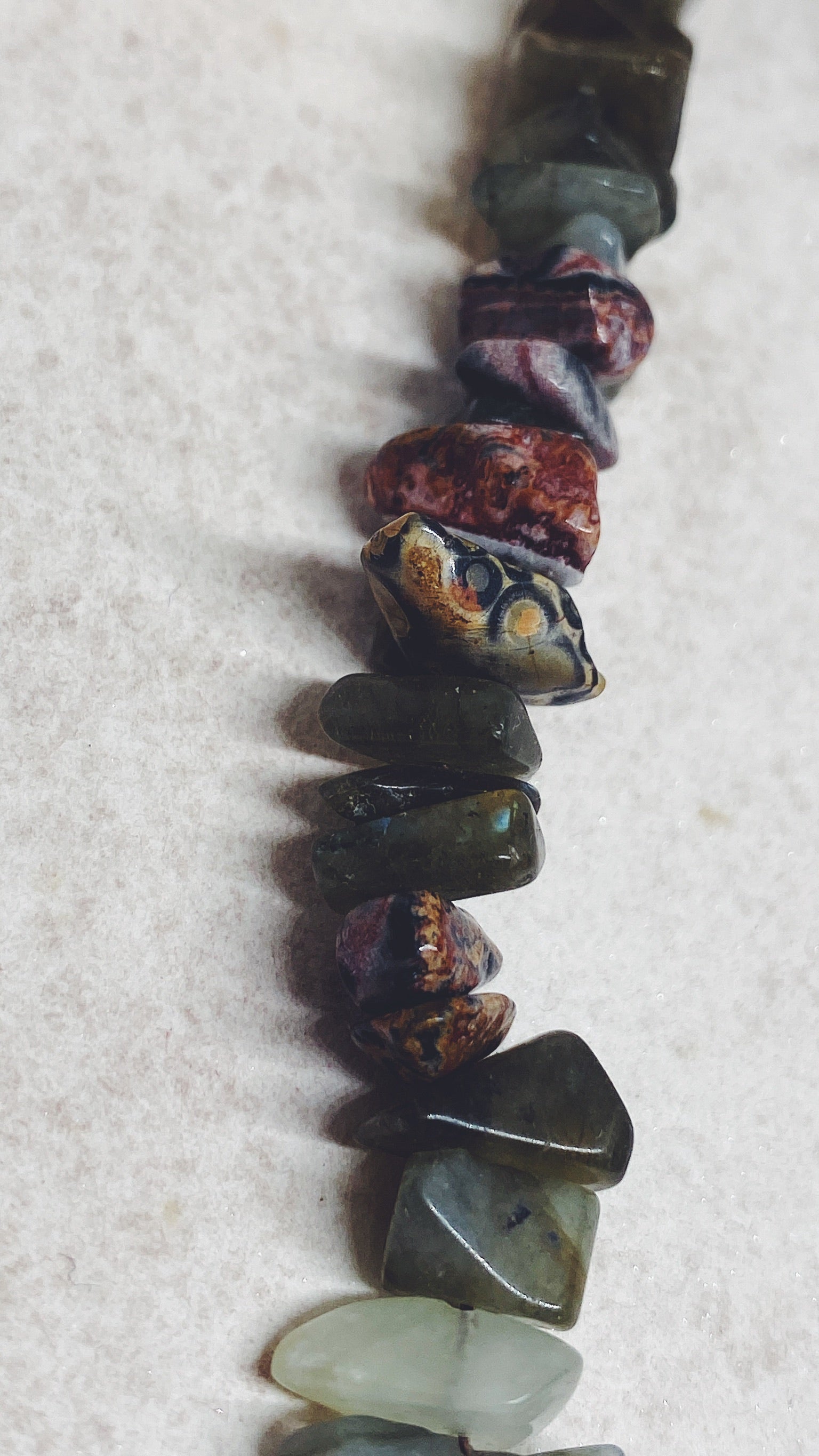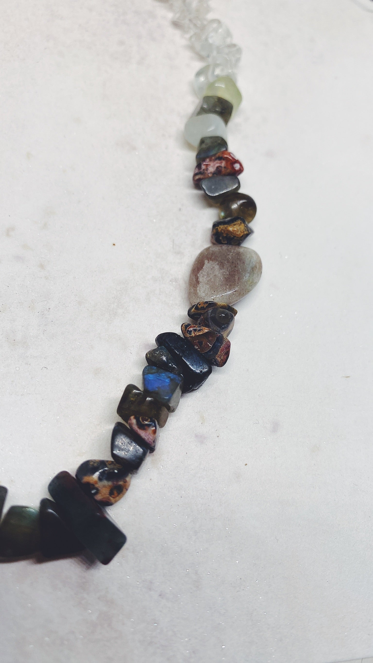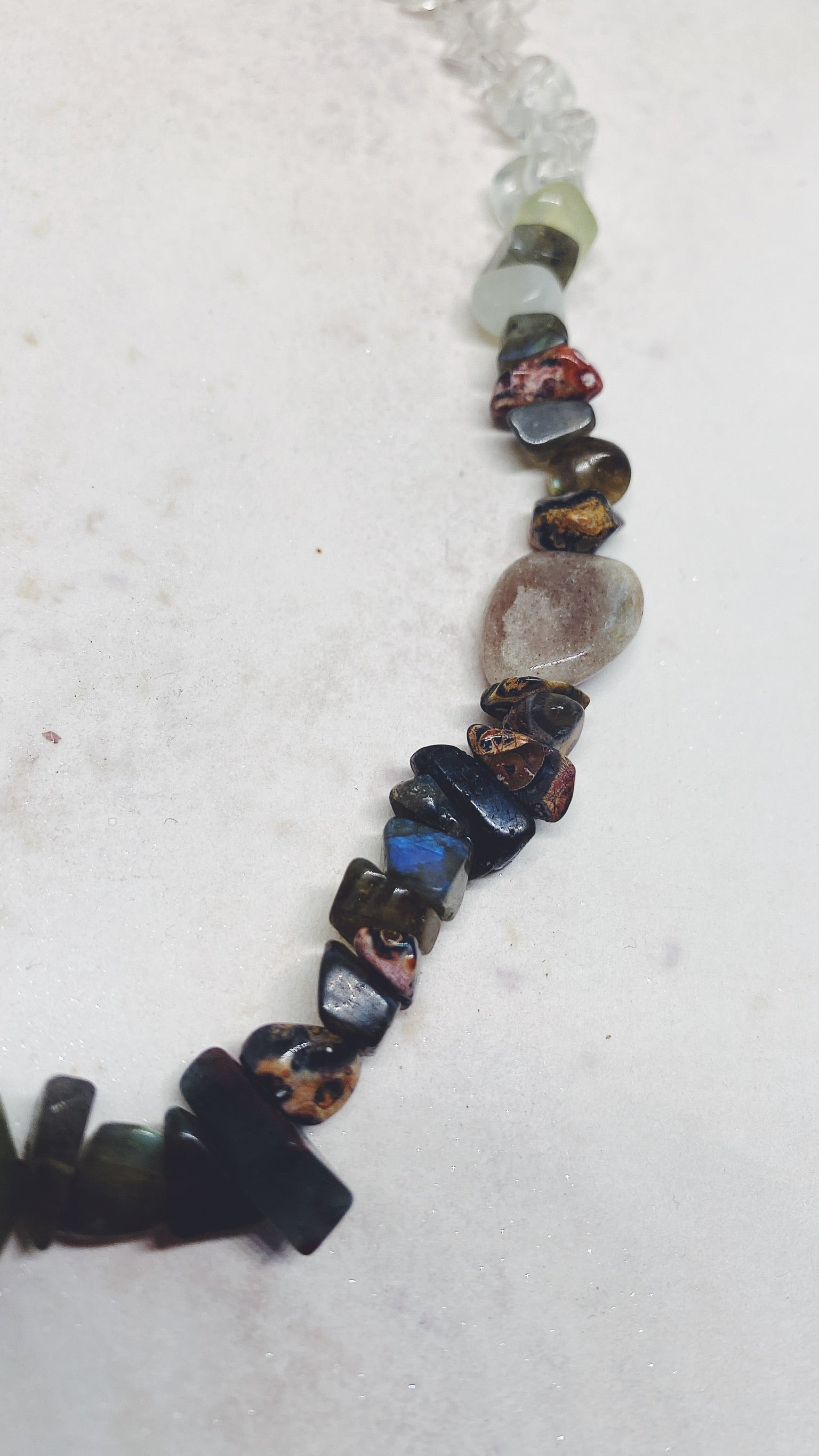 beads: clear quartz, labradorite, leopard agate, jade, agate.