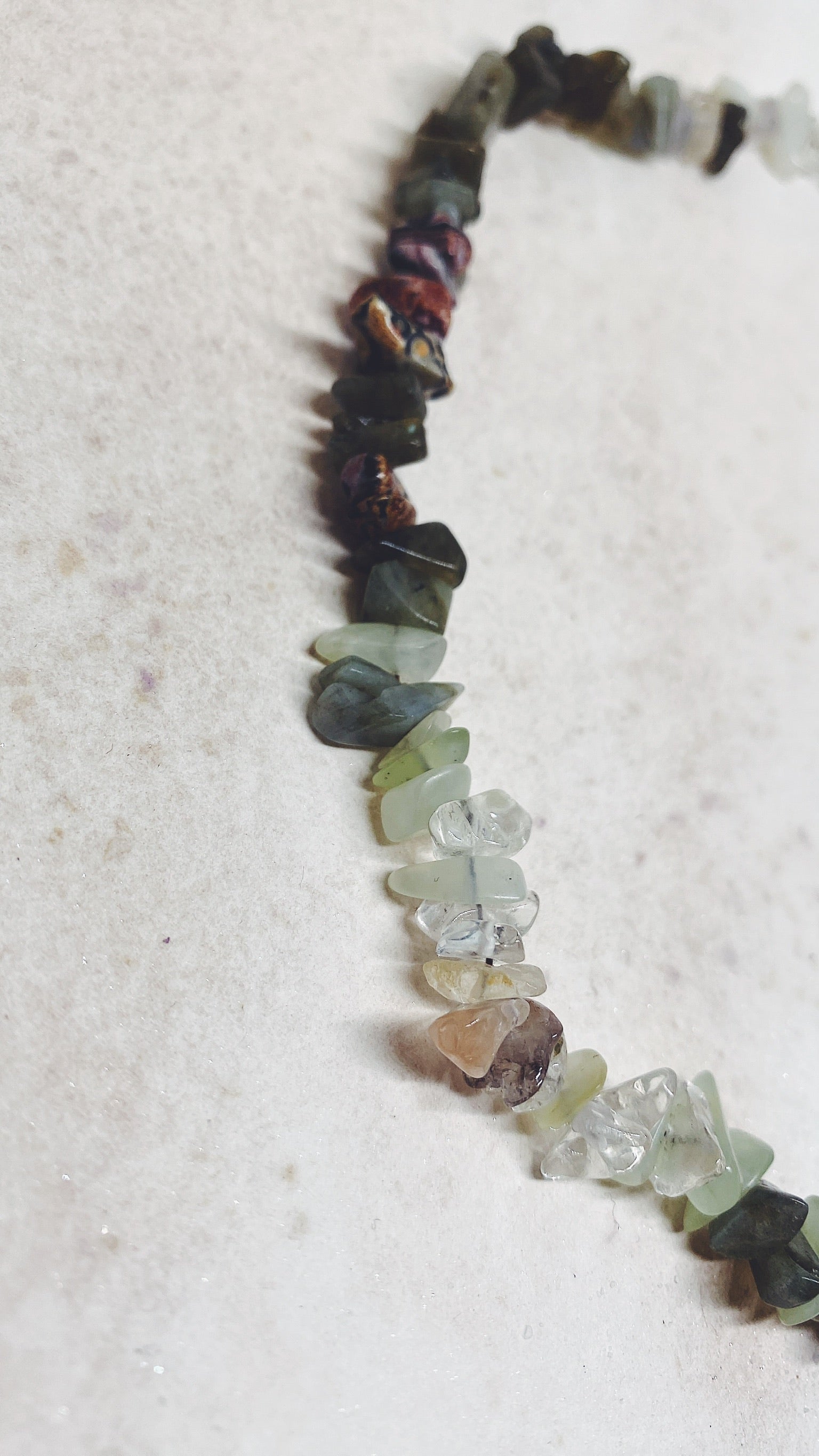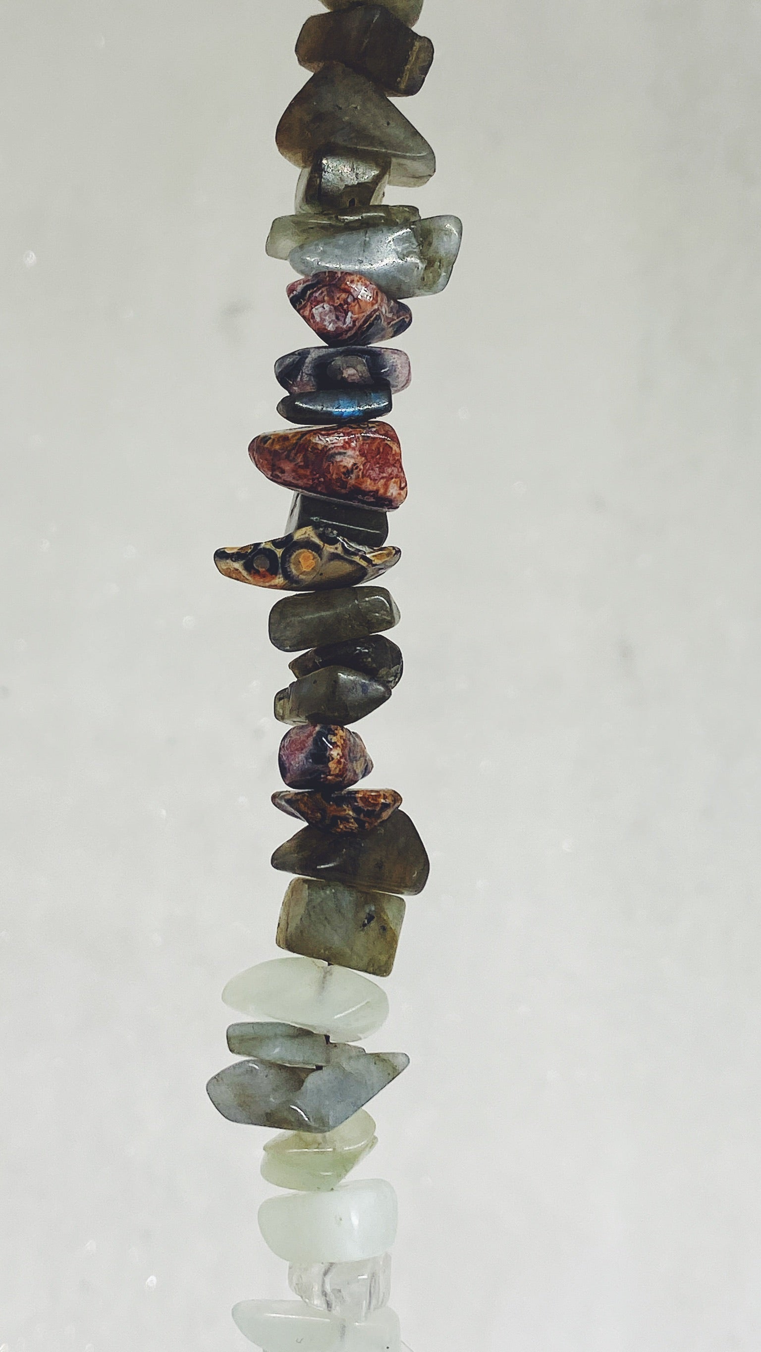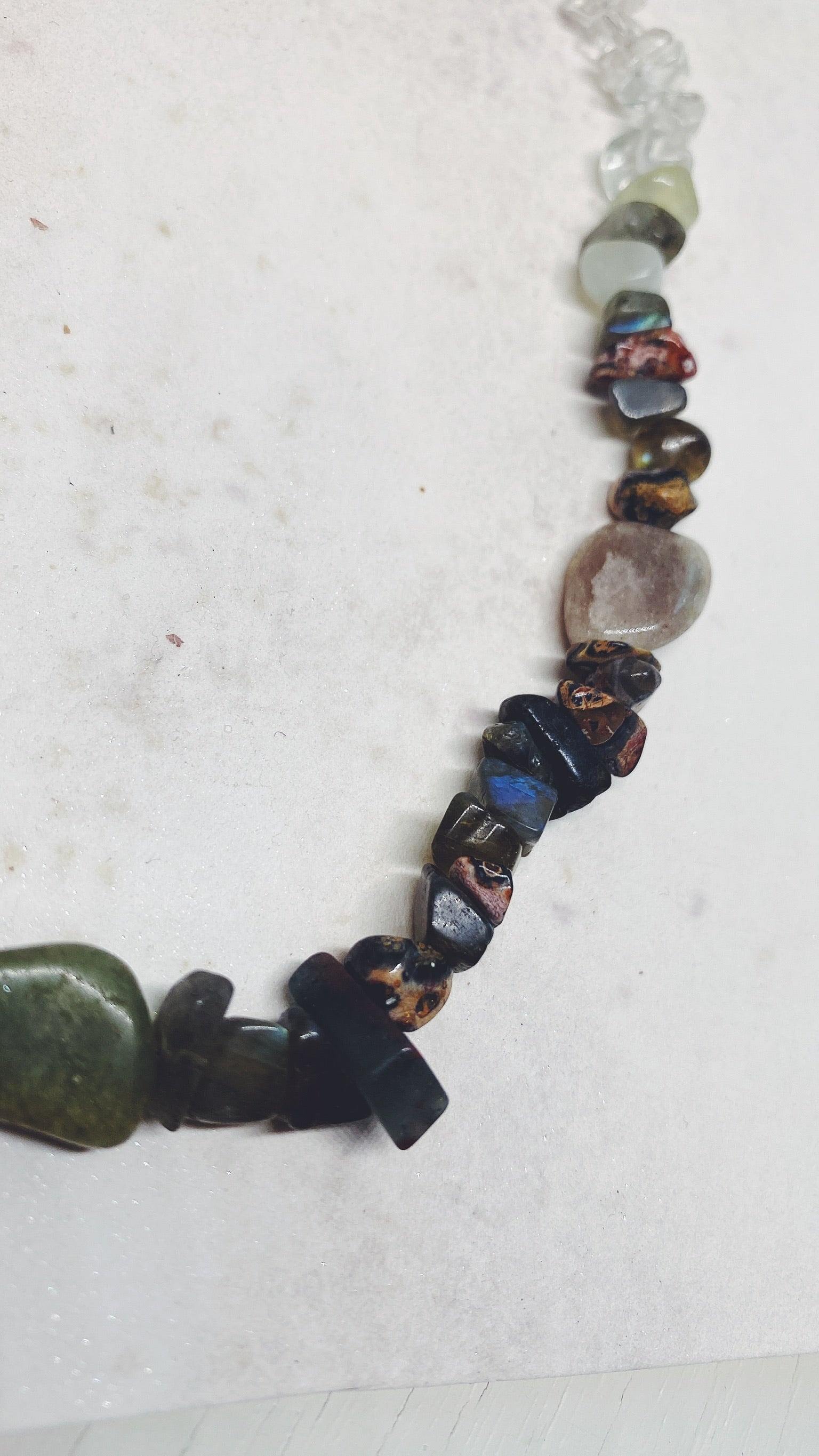 beads: clear quartz, labradorite, leopard agate, jade, agate.