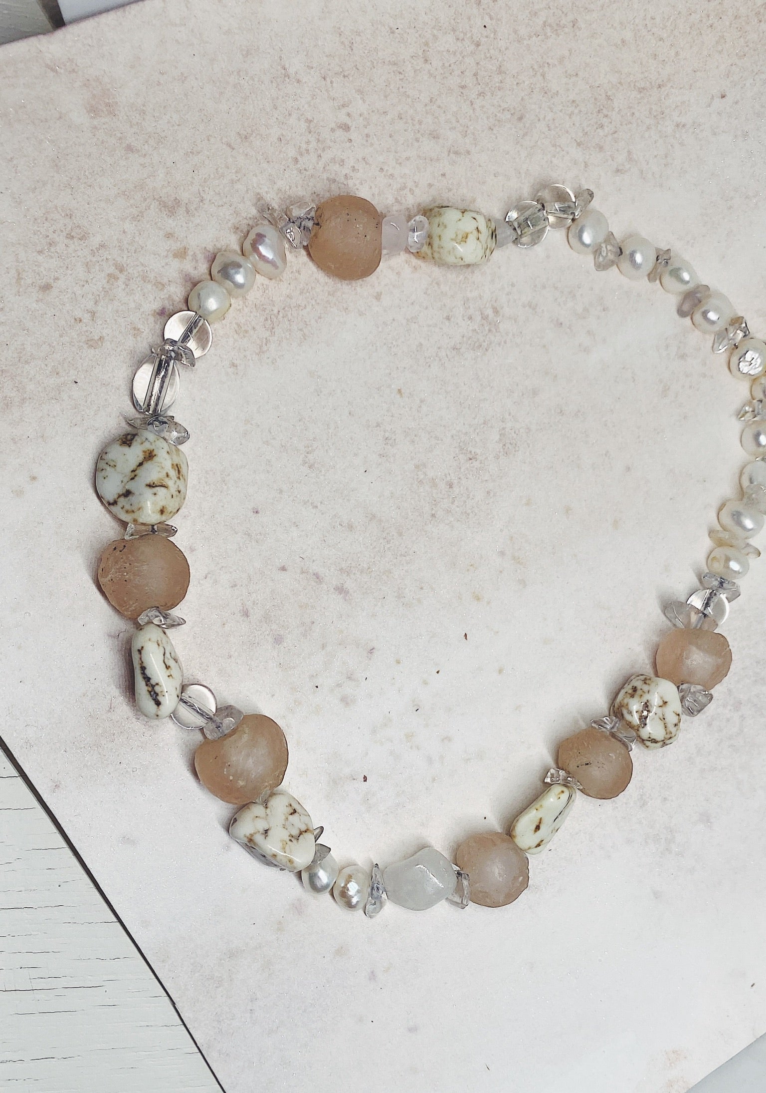 beads: freshwater pearl, howlite, clear quartz, artisanal fused glass, milky quartz.