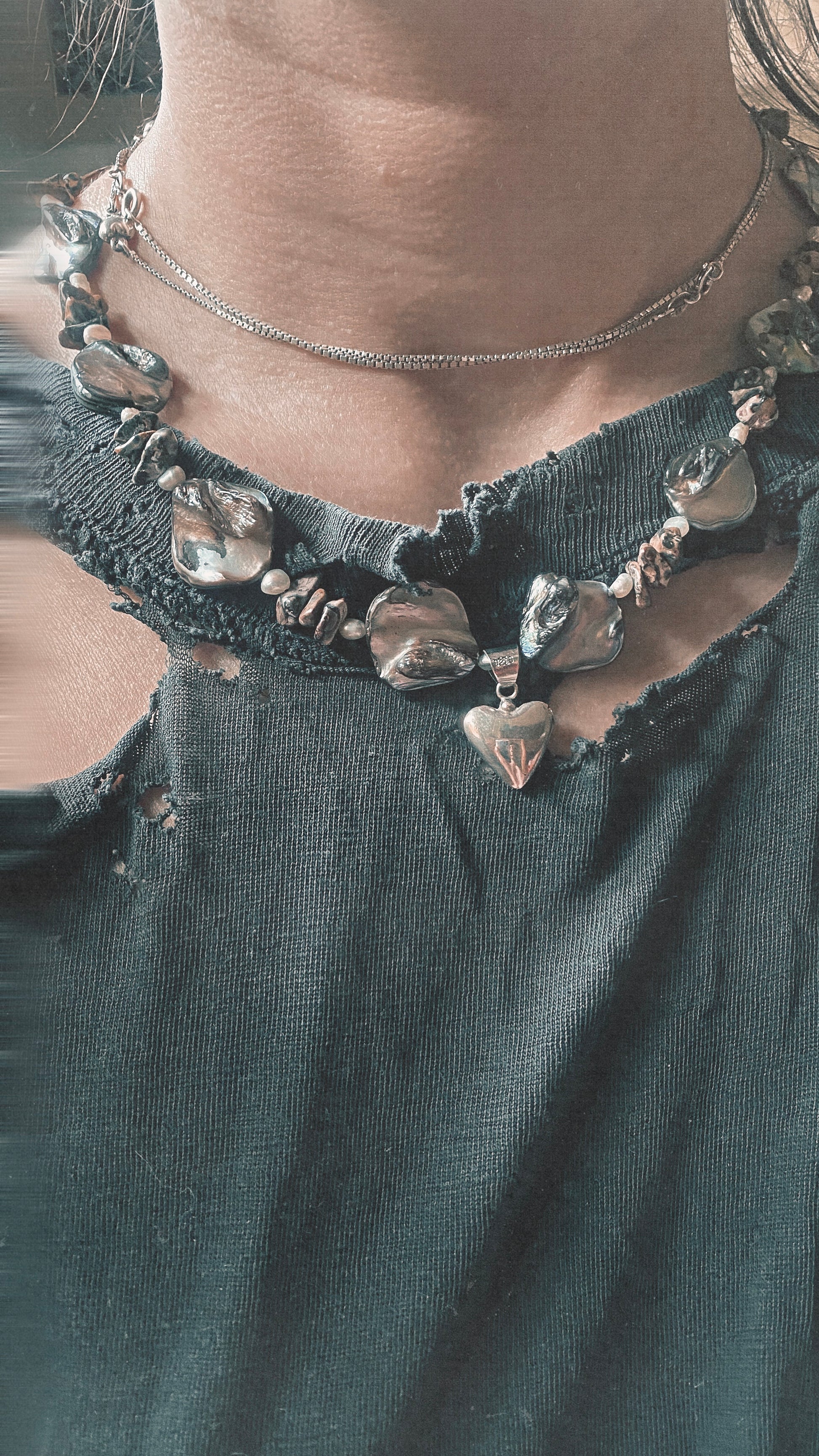 polished vintage seashell beads with evocative texture and shape, offset with natural leopard jasper chips, fresh water pearl and glass. vintage silver (925) heart pendant.