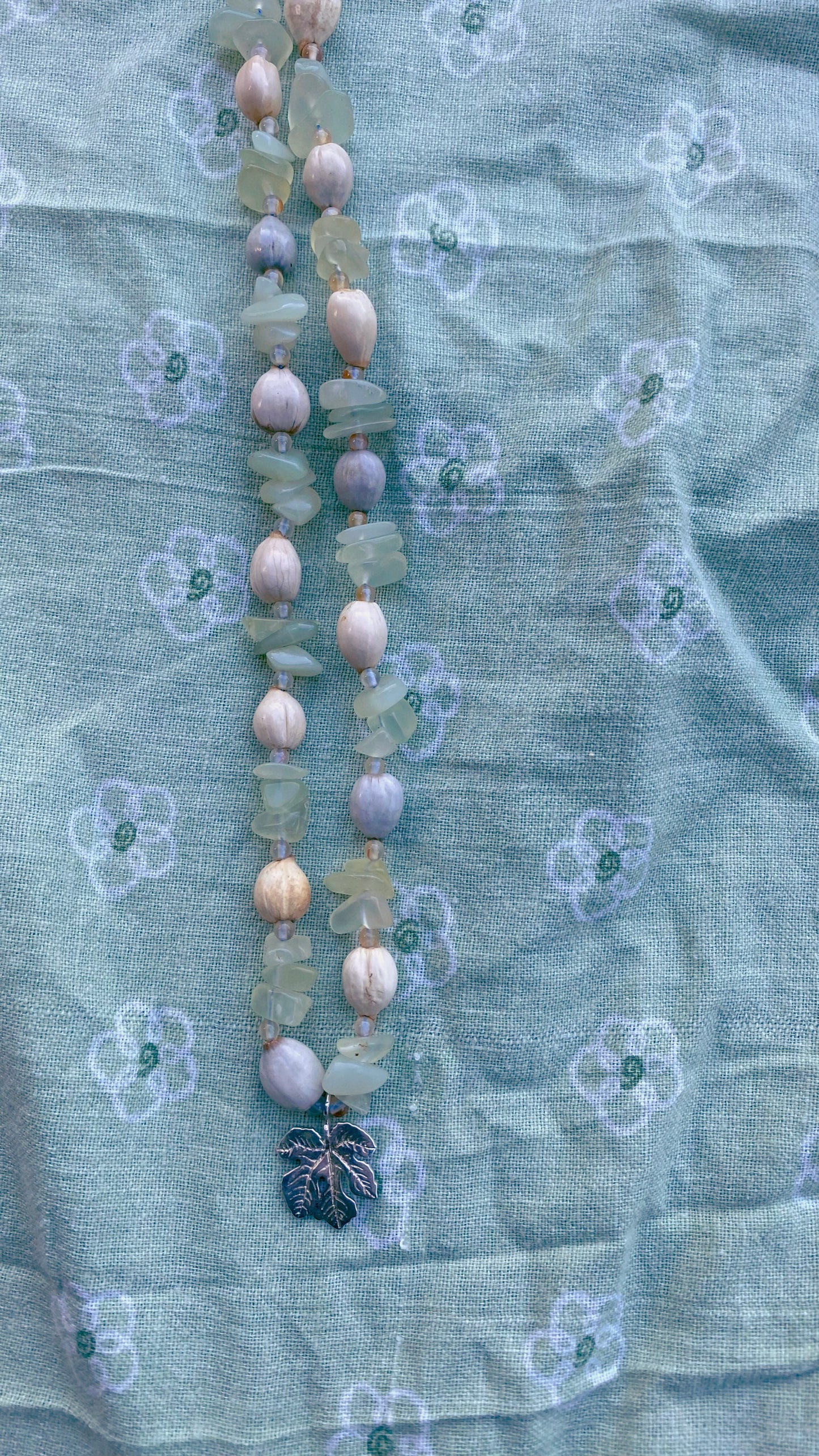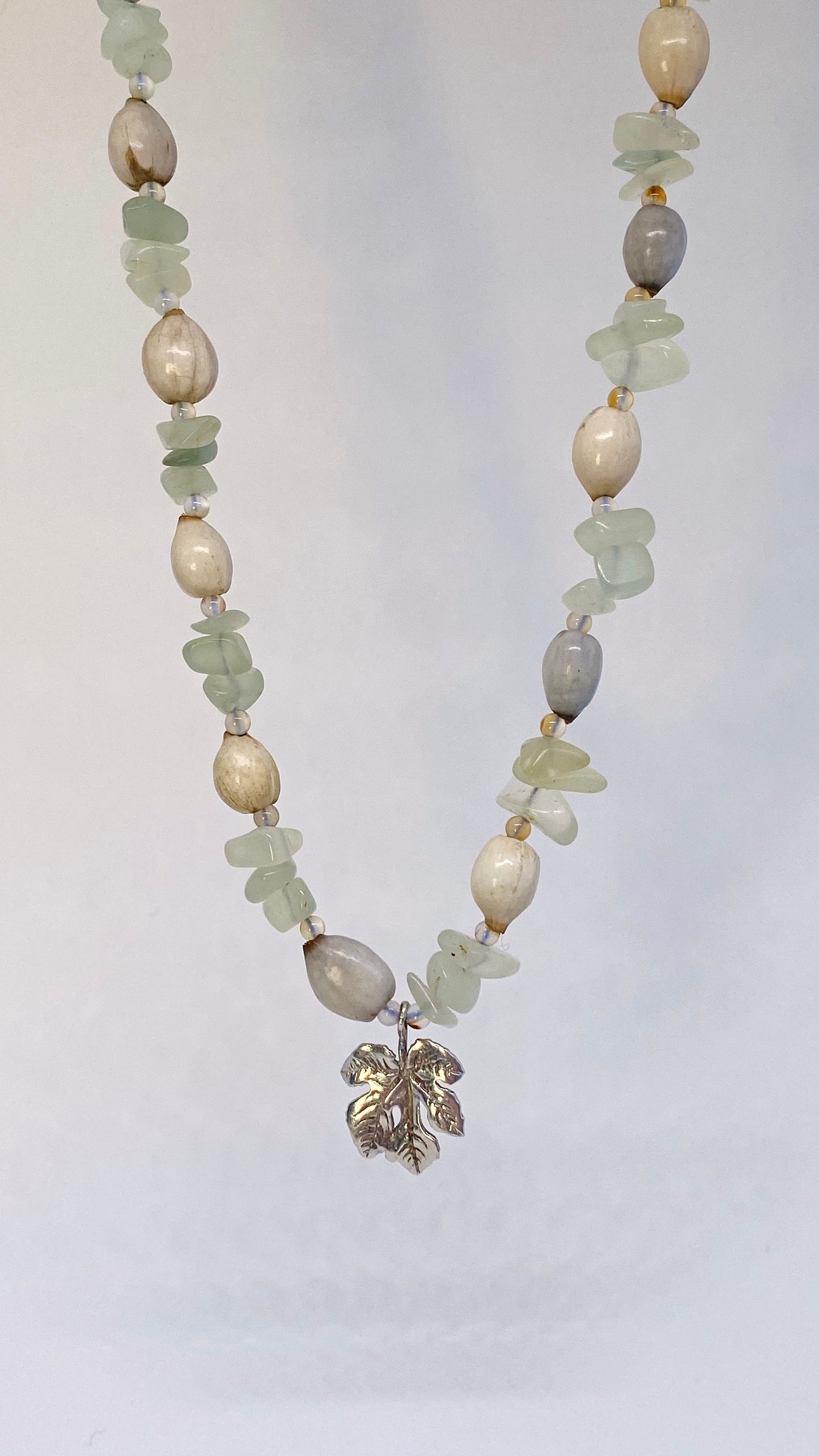 hand strung textured strand of jade, clear carnelian and job's tears. set with vintage silver (925) vine leaf pendant.