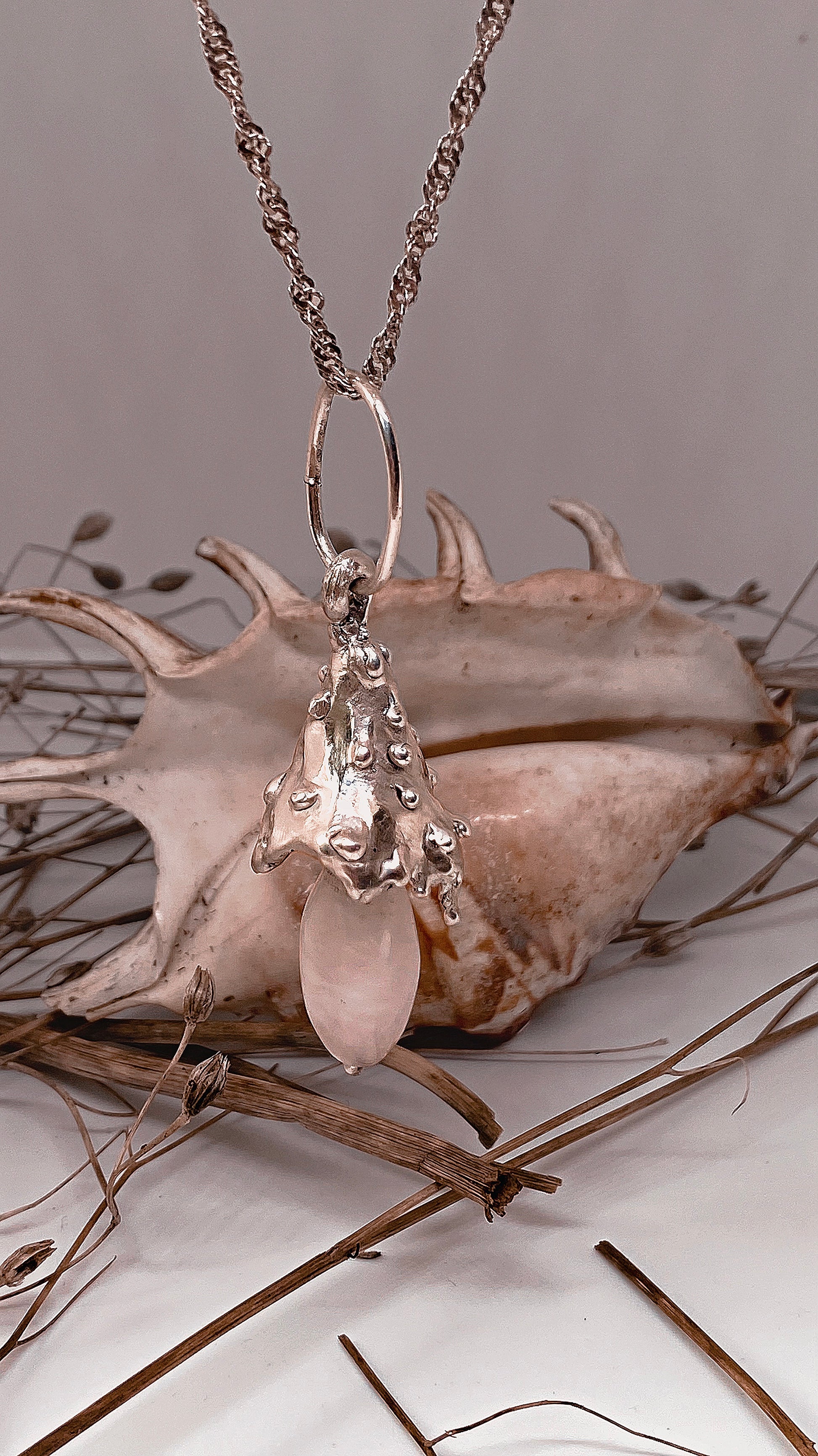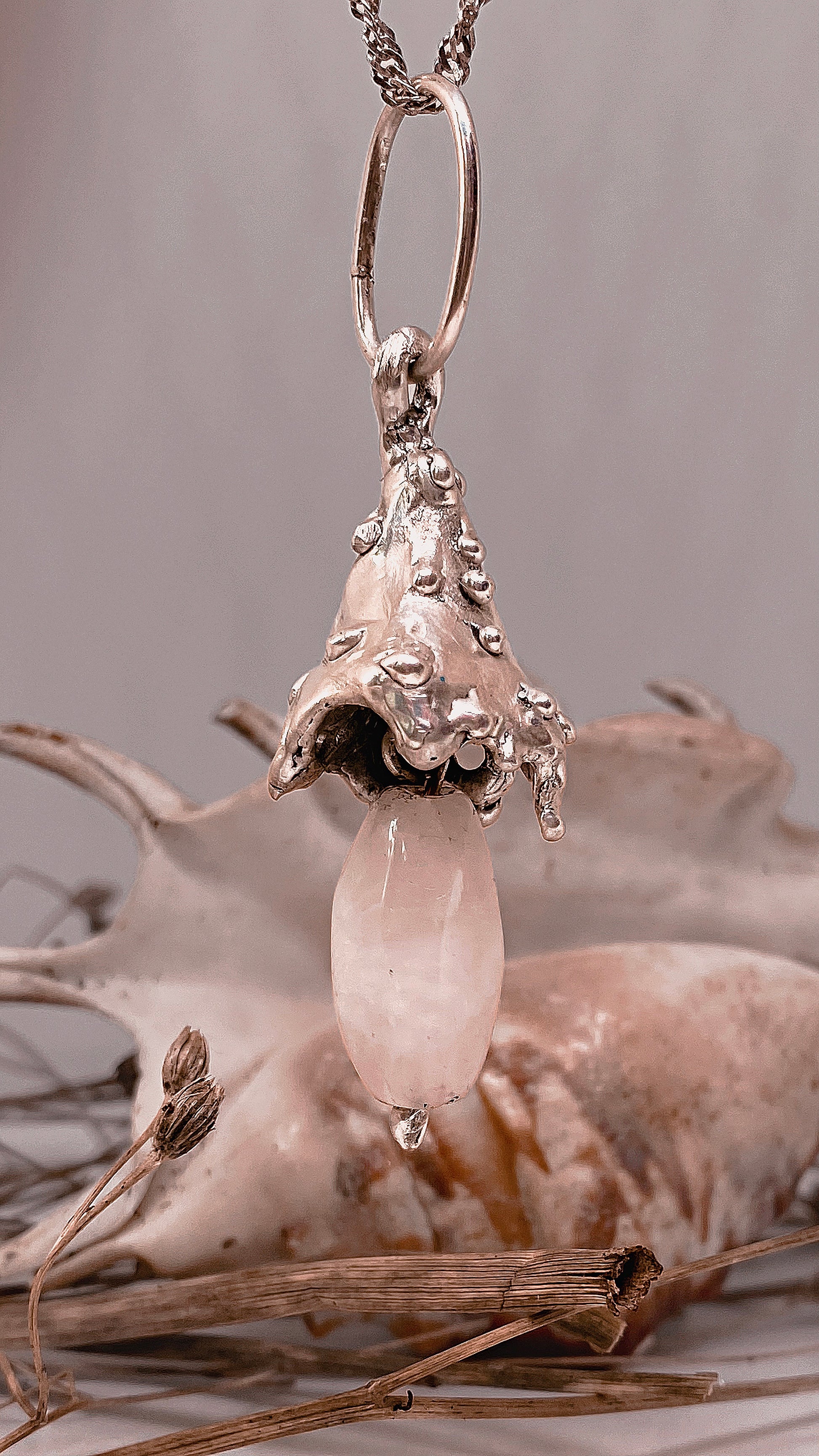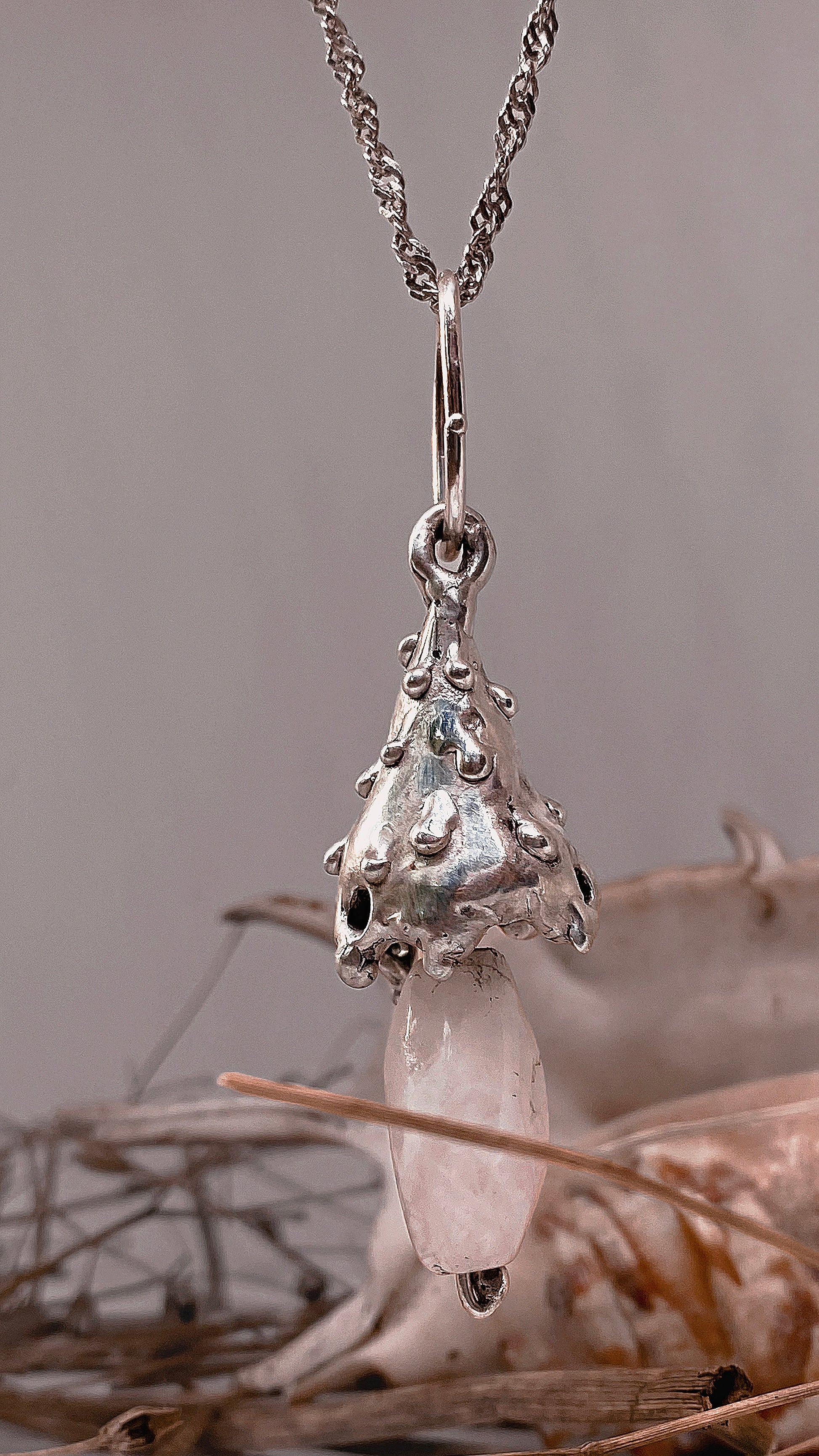 drippy cap mushroom with dangling milk quartz stem. part of a series but one of a kind and never to be cast again.